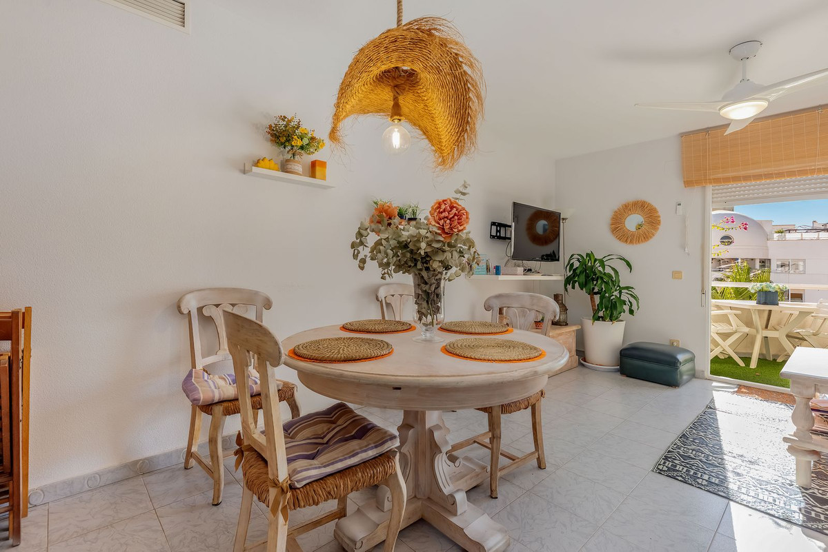 The property, built in 1994, features three double bedrooms and two bathrooms, both with renovated showers. The kitchen has been refurbished to a high standard, providing generous space and a smart design with a breakfast table. The light and airy lounge and dining area lead directly to an outdoor terrace with a staircase to the roof terrace. The private corner terrace spans 86 m² and includes a large storeroom. The south-facing orientation fills the apartment with natural light and a sense of spaciousness.