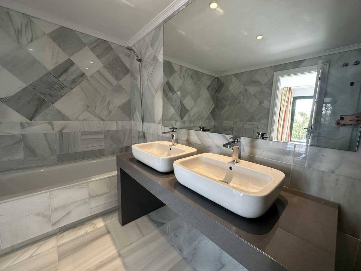 There are 2 bedrooms and each has it's own bathroom. The master bedroom is delightful. Bright and spacious enjoying the same views as the living area. It's large and well-appointed bathroom is elegant and functional and really does compliment the idea of a fully functioning master suite within this Monte Halcones apartment.