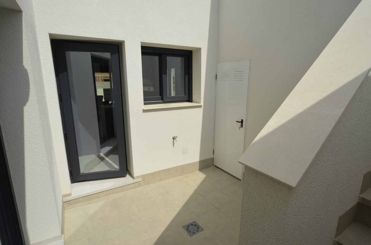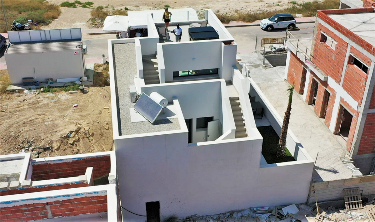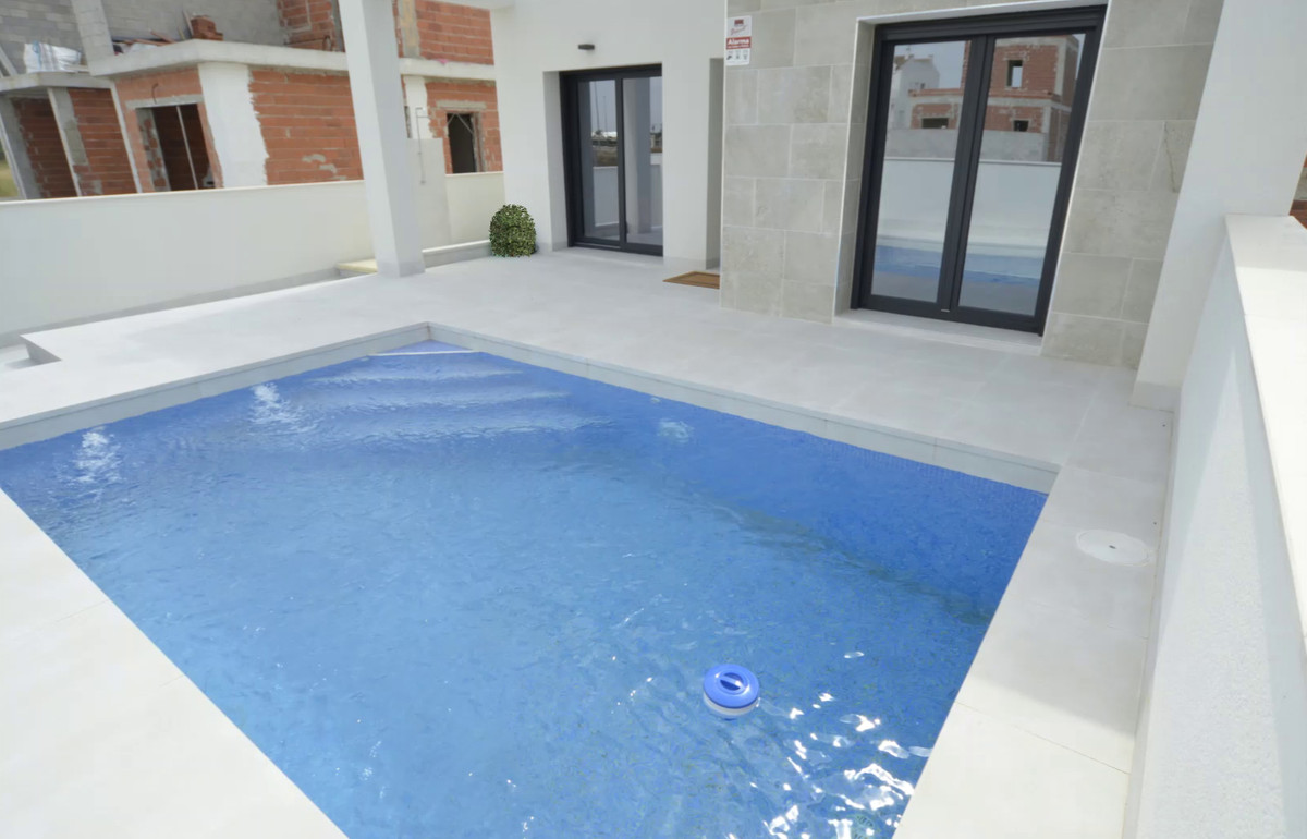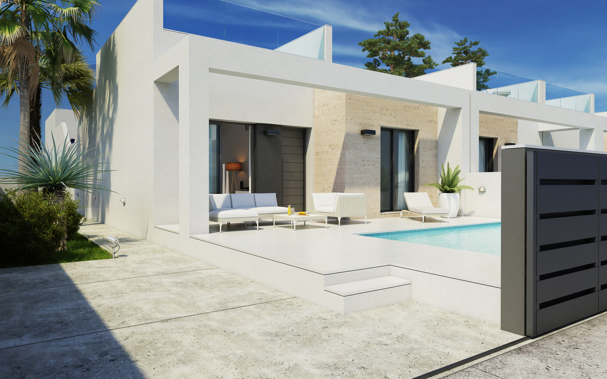 New build bungalows, all on one floor in the new part of Daya Nueva, a short walk to the centre of the town. 2 bedrooms, 2 bathrooms, solarium and private splash pool. Dining / living room with open plan kitchen, natural light, patio and stairs to solarium. Fitted wardrobes in both bedrooms and main bedroom with en suite bathroom and opening doors to the terrace and swimming pool.