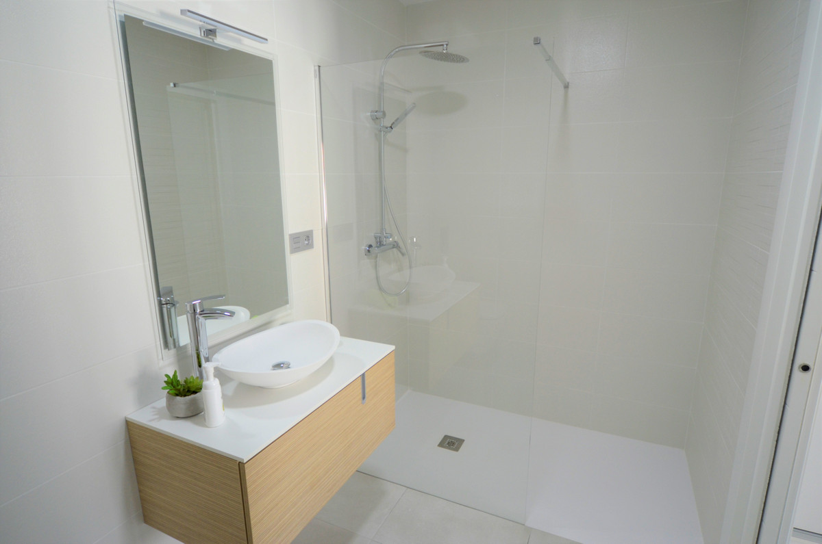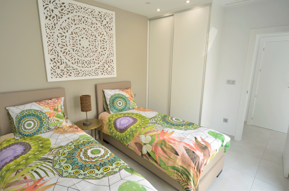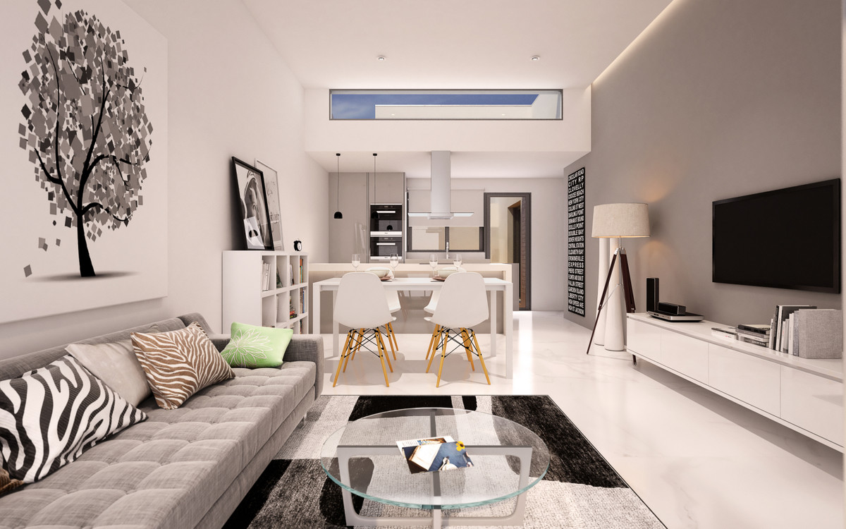 New build bungalows, all on one floor in the new part of Daya Nueva, a short walk to the centre of the town. 2 bedrooms, 2 bathrooms, solarium and private splash pool. Dining / living room with open plan kitchen, natural light, patio and stairs to solarium. Fitted wardrobes in both bedrooms and main bedroom with en suite bathroom and opening doors to the terrace and swimming pool.