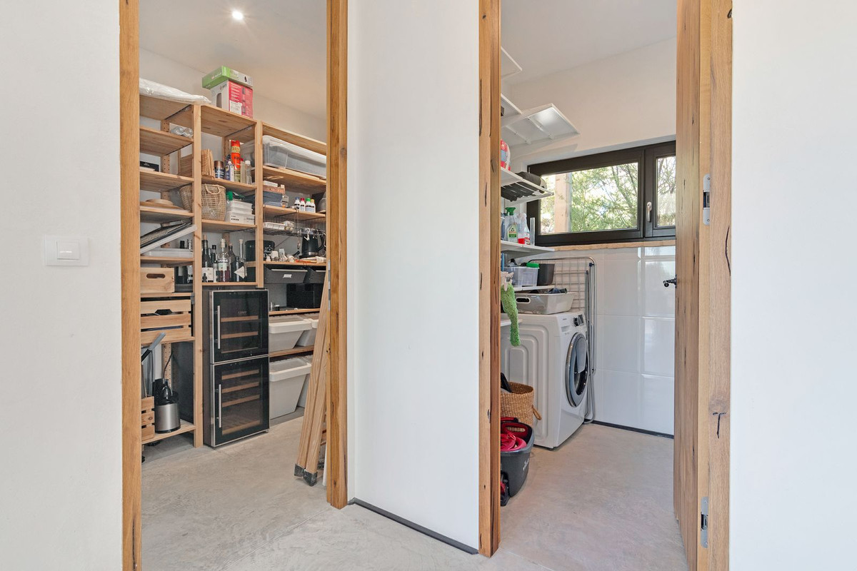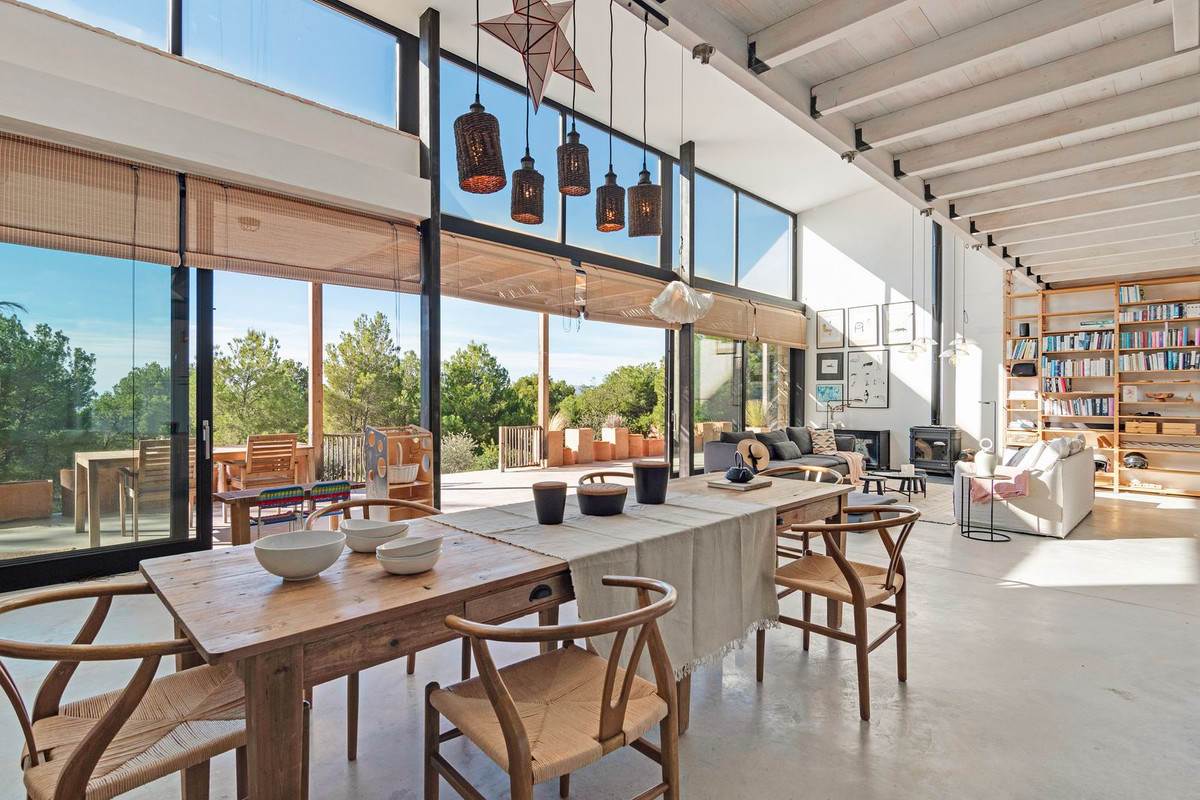 The open-plan, loft-style layout features high double ceilings, glass walls, and carefully curated décor. The lounge–kitchen–dining area opens onto a landscaped garden with a saltwater swimming pool and pine-filled horizon.
