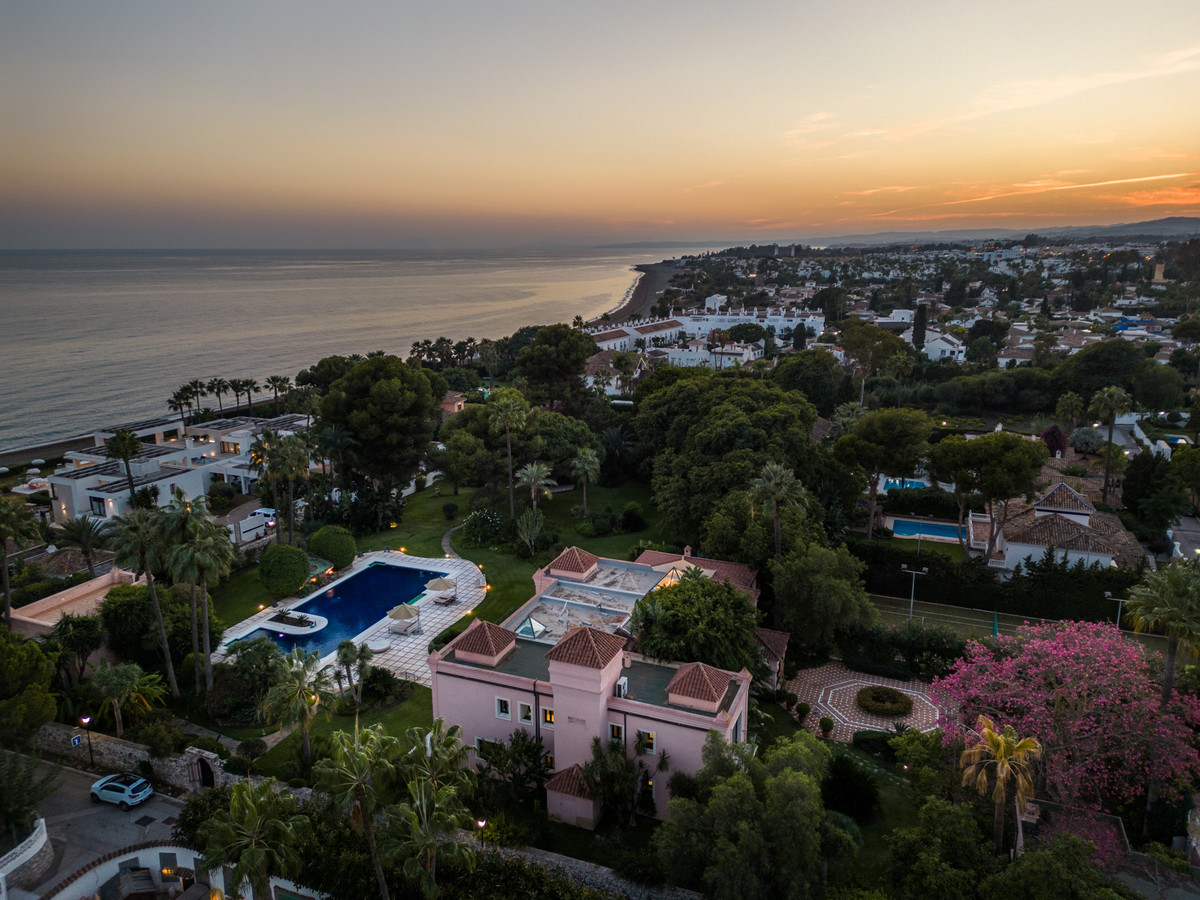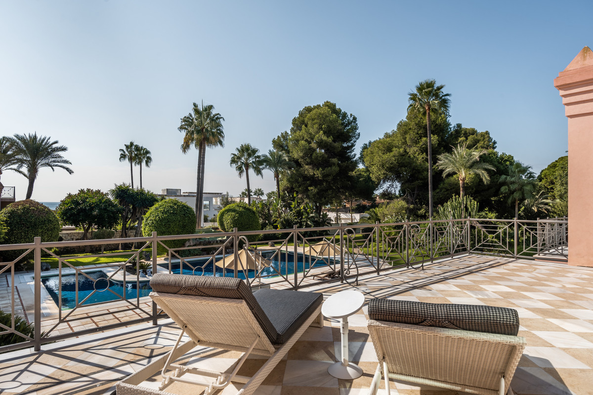 Sitting on an impressive 7,415 m² plot, this palatial residence, considered one of Marbella's Top-20 homes, boasts 8 bedrooms, 8 bathrooms, and a Caretakers House with 2 bedrooms and a bathroom. There's also potential to build an additional 500 m² house.