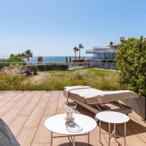 Ground Floor Apartment for sale in Cabo Bermejo, Estepona with 3 bedrooms, 2 bathrooms, 1 on suite bathroom, 2 toilets and with orientation south/east, with communal swimming pool, private garage and communal garden. Regarding property dimensions, it has 130 m² built and 40 m² terrace. Has the following facilities front line beach, transport near, air conditioning, fully fitted kitchen, marble floors, guest room, storage room, dining room, security service 24h, guest toilet, private terrace, kitchen equipped, living room, underfloor heating (throughout), fitted wardrobes, gated community, lift, garden view, pool view, beach side, underfloor heating (bathrooms), close to sea / beach, close to golf, glass doors, recently renovated / refurbished, close to shops, close to town and pets allowed.