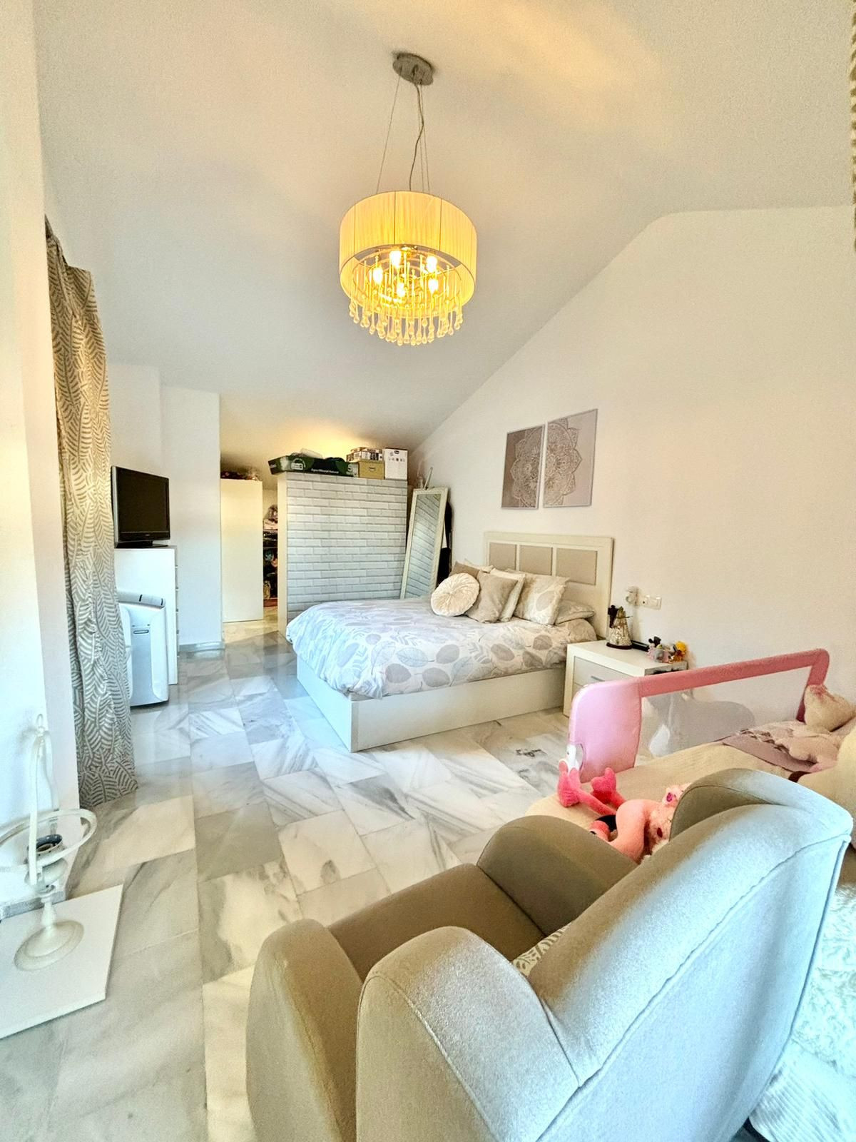 Den hvide spiraltrappe fører til anden sal. Det store soveværelse har walk-in closet og eget badeværelse. Det har også sin private terrasse, der giver mulighed for at nyde solen med udsigt over havet og bjergene.