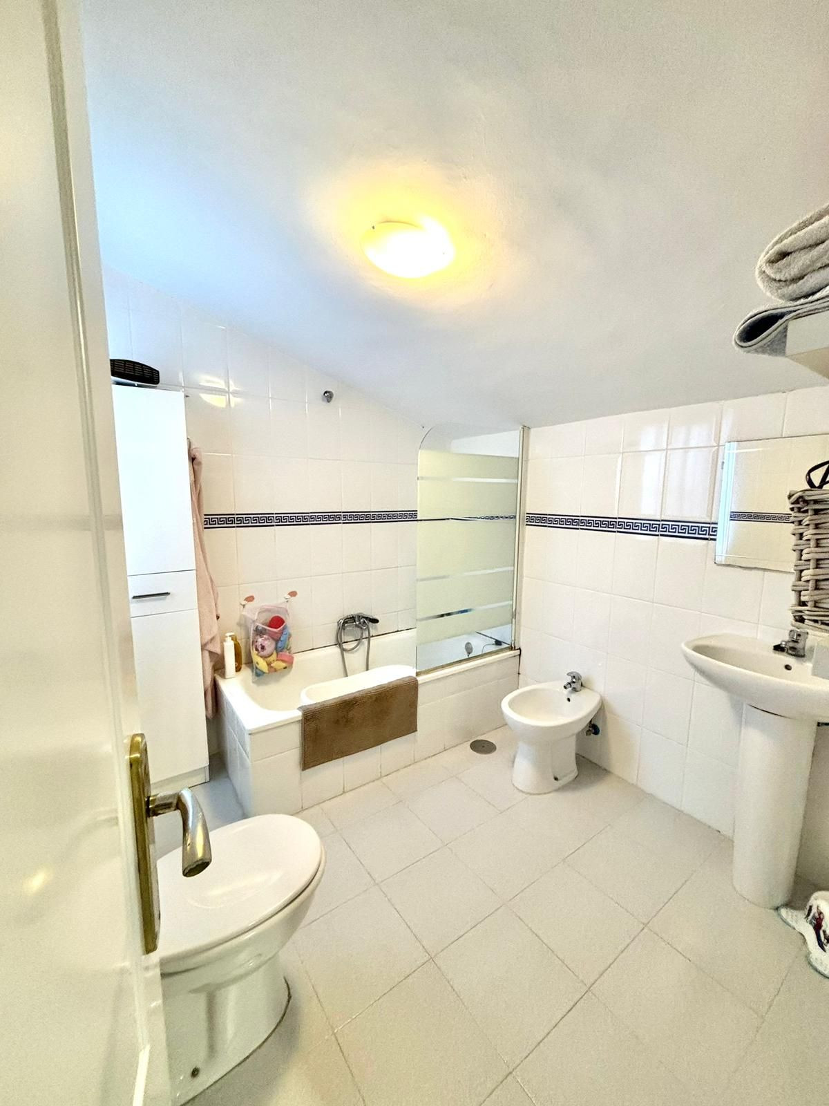 Første sal åbner til en klassisk hvid buet gang, der fører dig til en rummelig stue, der åbner ud til en solrig terrasse med hav- og bjergudsigt. Du finder køkkenet, spisepladsen og stuen for enden af gangen. Der er to soveværelser med dobbeltsenge, et badeværelse og et gæstetoilet på dette niveau, hvilket sikrer komfort og praktisk.