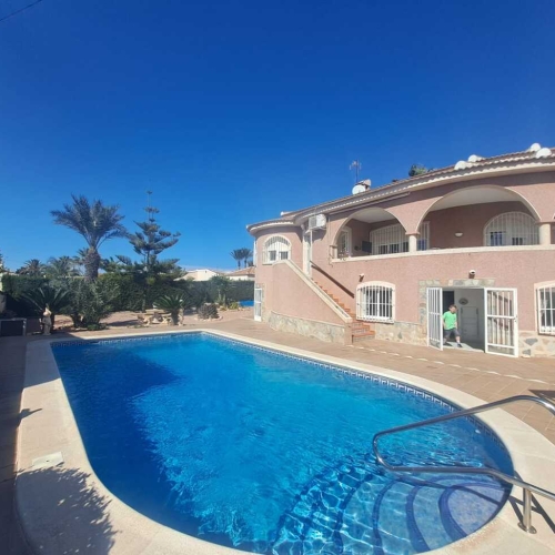 Here we have this is a Modern and spacious 4 (5) bed villa is located in a quiet area of Quesada with Stunning Salt lake views.  From the Private sun terrace you see across the Salt Lakes and out toward the Sea and Costa Blanca coast line, this property is located in a quiet area of Quesada, but only a short drive from all the amenities of Quesada and Dona Pepa. On entrance this is a 4 bed villa arranged across 2 floors, accessed from a large front terrace.  On the ground floor we have a modern and bright living space, here the large and modern kitchen, dining and living space offers plenty of room to arrange a layout of these areas as suits your needs.  Here also we have the Master bedroom with en suite and 2 double size bedrooms with fitted wardrobes, and a family bathroom, also some additional separate storage space, and outside separate from the kitchen a additional utility or laundry room.  On the 2nd floor there is a further 4th bedroom, and this has double access to the terraces/solarium of the property facing forwards towards the Salt lakes and at the rear across Quesada.  On this floor also there is an additional room, currently used as an office but equally could be a 5th bedroom or any space that you would prefer. This villa is well maintained and very well presented with excellent building quality,  integrated hot and cold air-conditioning, electric gates and security grills, alarm and a private, secure and fully wall plot.  This property can be sold part furnished. Outside the large covered terraces looks out over the bespoke designed and built swimming pool, and the rest of the property.  The villa is well situated on the 525 square meter plot, with spaces and areas around the villa at varying points throughout the day offering the sun and shade which provide quiet spaces to enjoy, to BBQ, or just relax.  T