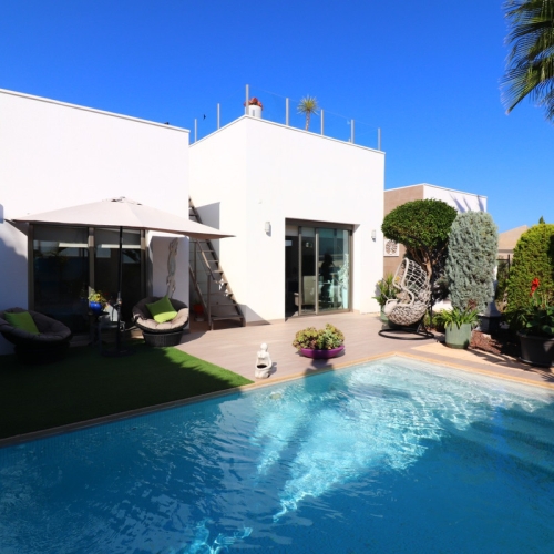 An East Facing, As New, Three Bedroom, Detached Villa with a Self contained Studio Apartment in Benijofar, which has it´s own access as well.  Situated with the parkland bordering just a five—ten minute walk to the amenities Benijofar has to offer, including medical centre, school, bars, restaurants, McDonalds, shops, bank, supermarket, pharmacy and just a couple of minutes by car to a main chain supermarket, Quesada, Rojales and it´s La Marquesa Golf Course.  The beaches along the coast can be reached in approximately ten minutes by car.  This as new modern villa having a tourist licence, offers the opportunity of two excellent rental incomes, something that the current owner has made successful.  The main villa offers bright open plan living; lounge/dining room with stairs leading up to the first floor; fitted kitchen with island unit and door leading out; utility room; family shower room; double bedroom with walk in wardrobe and sliding doors leading out to the pool area.  On the first floor there are a further two double bedrooms with built-in wardrobes and en suite shower rooms, master with terrace; steps lead up to the private roof top solarium, where you can enjoy views across to the mountains.  The garden is tiled with a private pool, BBQ area, car access.  The self contained 70m2 studio apartment is accessed via another street, is open plan with a living area, fitted kitchen, open bedroom area and a shower room.  The property benefits from ducted air con, the apartment having air con unit.  This is totally, a one off opportunity not to be missed.\n
