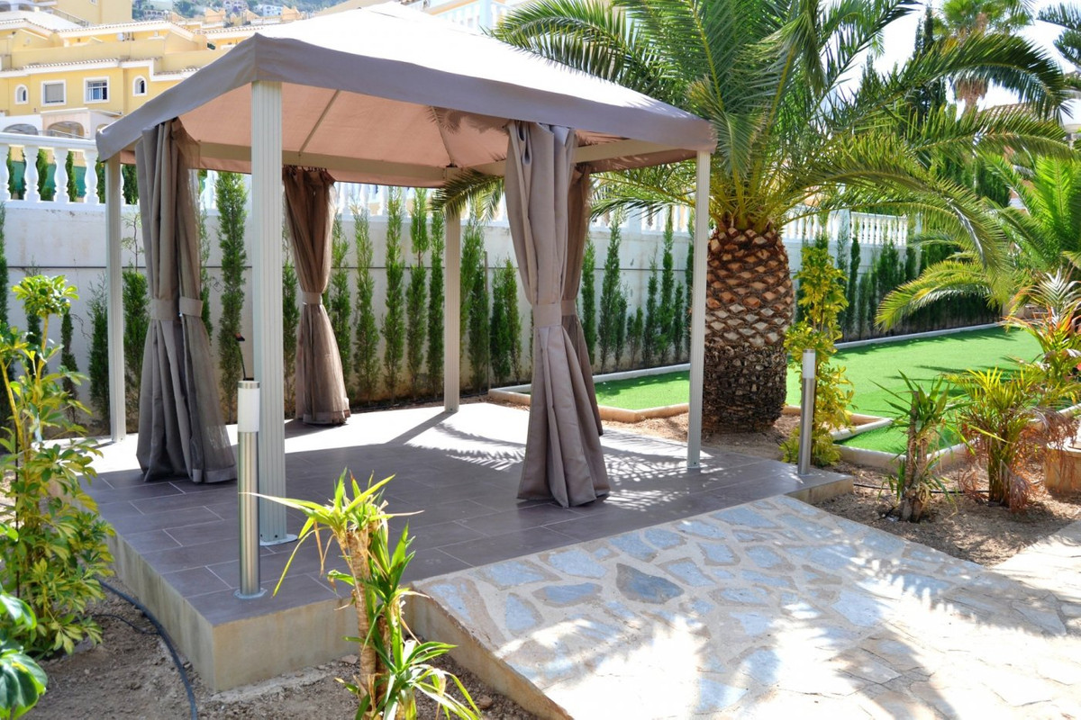 This prestigious villa has about 460m² and a fantastic view over sea.~ ~ It is situated on a plane plot of 3.560 m² with mature trees. The well-equipped property, with every comfort, makes of this house a perfect luxurious villa. The electric driven entrance doors leads into the park, with garden and a little pond, a fountain and a gazebo. The gateway leads to a big garage for several cars. The villa has two floors, divided as follows: on the ground floor there are three bedrooms, and two bathrooms. Also it has a private office. The master bedroom is very spacious and is provided with an attractive ensuite bathroom with a very big tub and Jacuzzi. Shower and toilet with bidet are separated. All the stone columns are covered whit an Italian marble of the highest quality. The living room is divided into several sections separated by arches and columns.~ ~ The leather sofas and the big fireplace give this room a luxurious style. The electric installations, with his light regulators, can create a positive and even romantic atmosphere. From the living room you have direct access to the balcony where you can enjoy magnificent views over the city, Calpe and the sea. The dining area is also separated by arches and offers an ideal space for numerous meetings. On the same floor there is a big kitchen with a storage room and a spacious bedroom with bathroom divided by an arch in the middle, what gives the whole room a special touch. All rooms are equipped with sound systems of a high quality. If you go upstairs you can reach a big terrace and enjoy a breath taking view over Calpe and the natural park "Peñón de Ifach". There is also a room that is currently equipped as an office.~ ~ There are several doors that lead from the living room to the terrace, a little courtyard and the swimming pool (size 6.5 x 13 m.). On it, there is an area with a fountain (80 cm deep) designed especially for little children.~ ~ Right after the pool area you'll find the completely equipped summer kitchen, which you can enjoy almost the whole year long, thanks to the good weather that the Mediterranean coast offers. The entire kitchen is provided with modern equipment and has an open grill. This is a perfect space for barbecues and suitable for numerous meetings. There is also a toilet and a shower in this area.~ ~ This magnificent villa stands out for having a fully equipped private discotheque and a fitness room with various machines for bodybuilding and maintenance, and for having underfloor heating through all the property.~ ~ Distinguished by its high quality and privacy, located in Calpe within a quiet and private residential resort, this property has an easy access from the highway of Alicante, Valencia, or from the centre of the city. Equipped with everything a person could wish for.