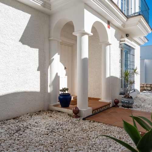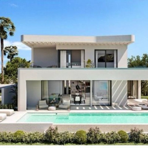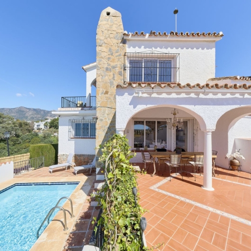 Contemporary designer villa with breathtaking views towards the sea. The villa comprises of two floors with main entrance on the upper level. From the moment you step through the front door, you are struck by the fantastic view thanks to the floor-to-ceiling glass doors along the whole front side of the house. The upper floor is characterized by an open floor plan that houses a kitchen island, integrated kitchen cabinets, dining area and sofa group. In the middle sits a glass wine cabinet. On this floor is also the master bedroom with bathroom en-suite and private dressing room. Outside the large glass doors is a lovely covered terrace that leads out to a wooden deck and lawn. From the wooden deck, a three-meter-wide staircase leads down to the 67 m2 pool with Jacuzzi. The villa´s two floors are connected by the specially designed staircase, which is the jewel of the house. On the lower level there are four bedrooms, each with an en-suite bathroom with glass walls, a guest toilet, a TV-room with a small kitchen and a fireplace, a laundry room and a large double garage. Three of the four bedrooms and the TV-room have access to the wooden deck next to the pool where, in addition to space for sun loungers and a dining table, there is an outdoor kitchen, barbecue and toilet, all protected by roll-up canvas roofs. The villa is equipped with air conditioning, under floor heating, alarms, security cameras, home automation, etc. The villa is located on one of the best plots in the exclusive Reserva del Higueron urbanization on the border between Fuengirola and Benalmadena only 15 minutes from Malaga International Airport. In the area there is the 5-star Hotel Hilton, sports club with gym, spa, padel and tennis courts and a Michelin restaurant.