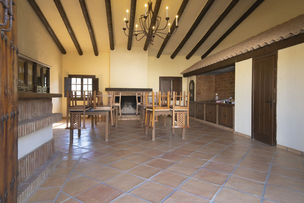 At the core of the estate stands a U-shaped Andalusian-style country house, covering an impressive 1,385 m² on a single floor. The farmhouse surrounds a paved courtyard and includes three separate dwellings, a chapel, a wine cellar-lounge, kitchens, offices, storerooms, and two covered porches. All seven habitable spaces are equipped with air conditioning and fireplaces for comfort. Large covered terraces and gardens surround the property, offering stunning panoramic views into the valley and to the mountain.
