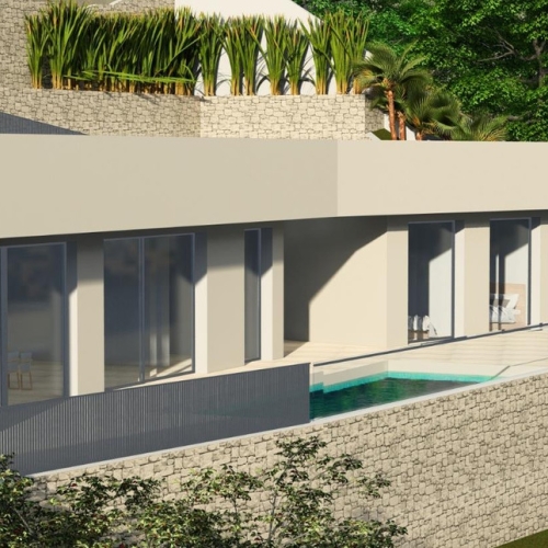 Dette fantastiske projekt er designet til en stor grund på 1000 m² med en betagende udsigt til bjergene i Monte Solana-området i Pedreguer. Kun 3 minutters kørsel fra byen og under 15 minutter fra Dénia-kysten. Grunden vender mod SYD og har spektakulær udsigt til naturparken og bjergene.