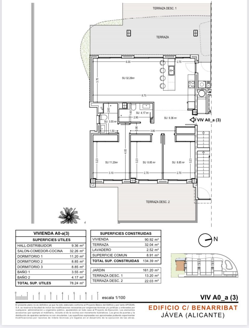 The flat is located on the ground floor of the building, which allows to obtain a private garden, extra large, 161m2. with 3 terraces: covered terrace has 32,04m2, uncovered terrace has 13m2, second uncovered terrace has 22m2. The flat itself consists of 3 bedrooms, 2 bathrooms, living - dining room, open plan fully equipped kitchen, laundry room. The flat has 134,39 m2 constructed area.