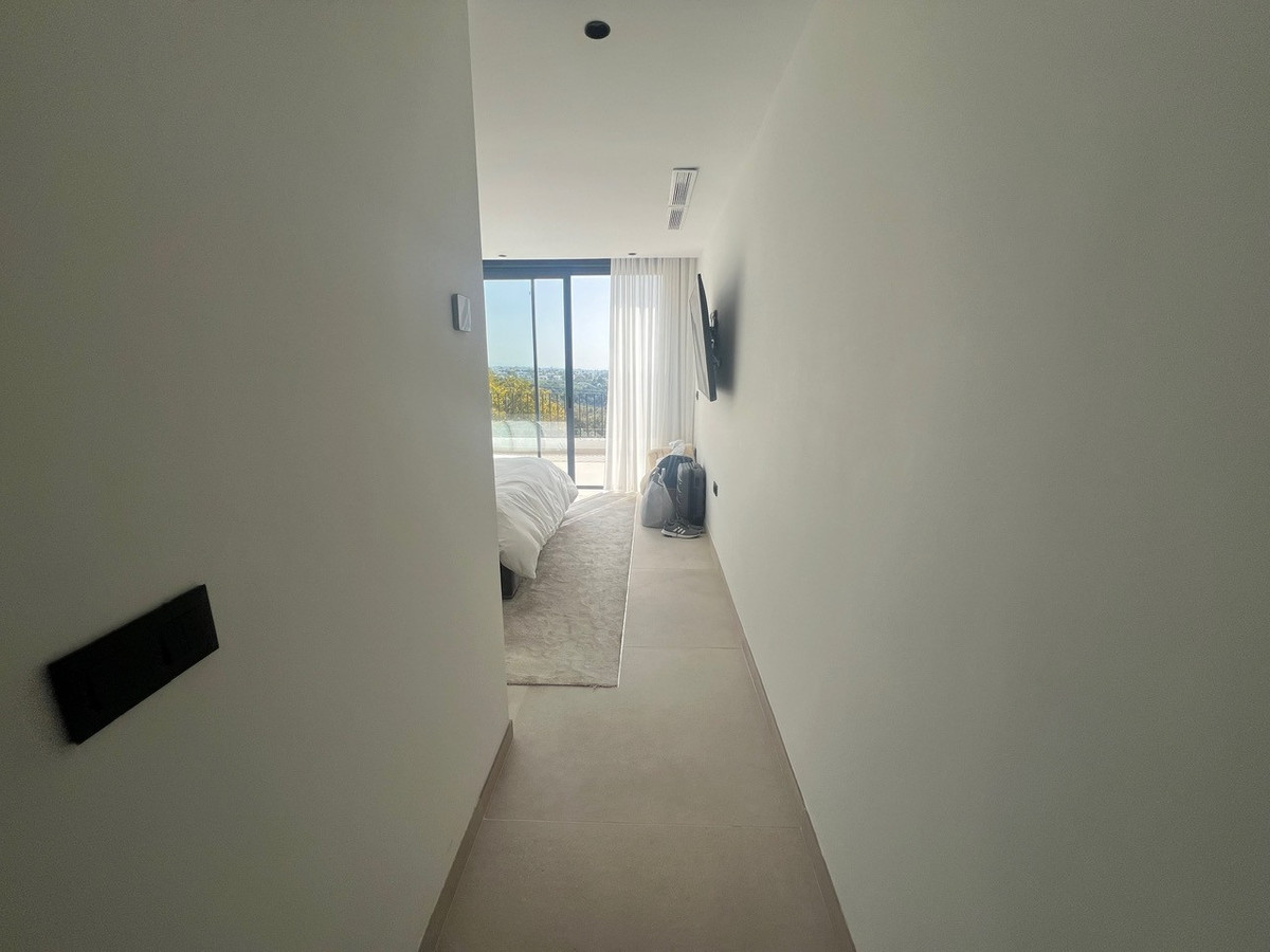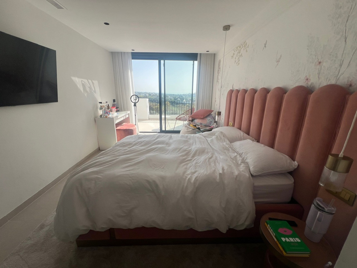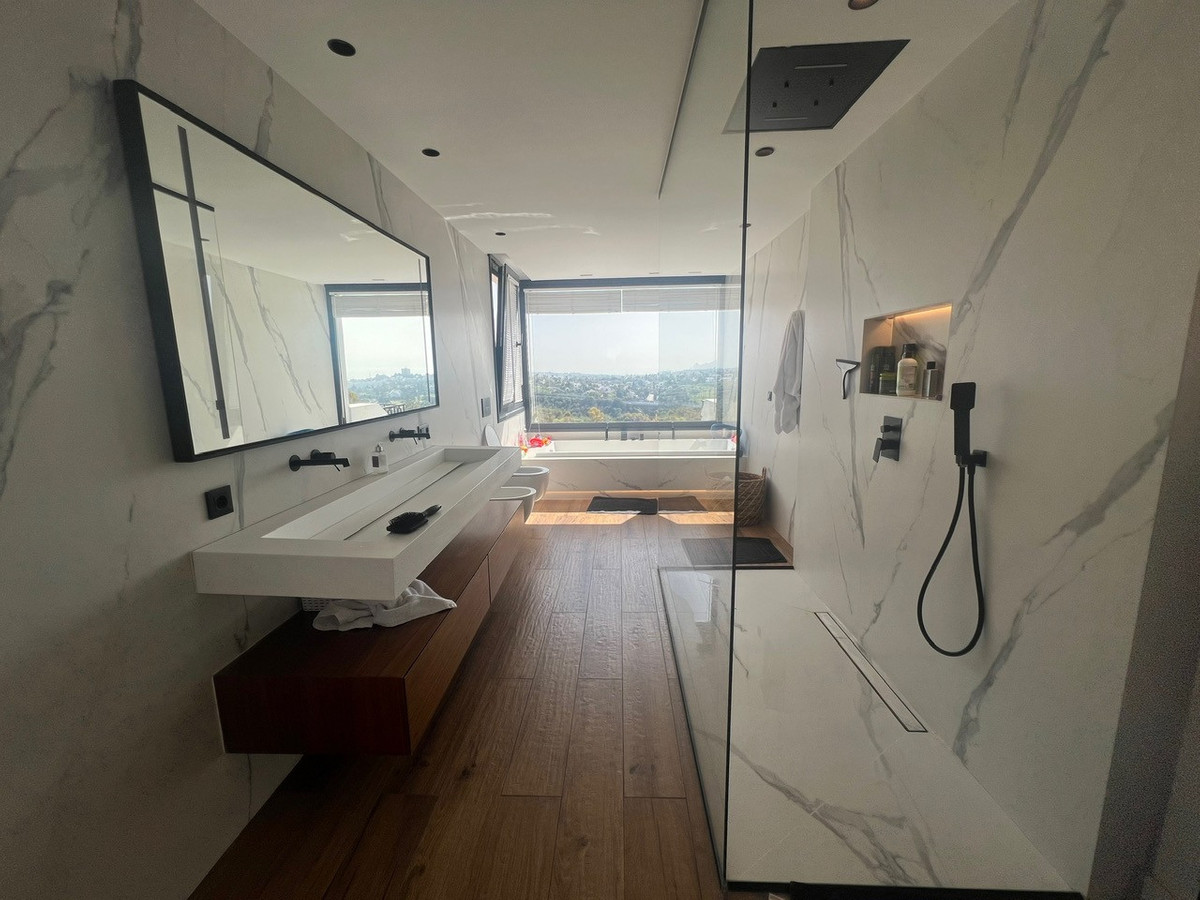 The first floor hosts three elegant en-suite bedrooms, two with private terraces. The top-level master suite is a private retreat, complete with a luxurious en-suite bathroom featuring a rain shower and freestanding bathtub overlooking panoramic views.