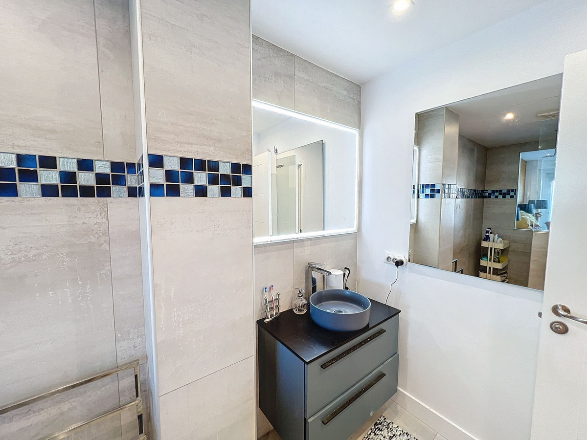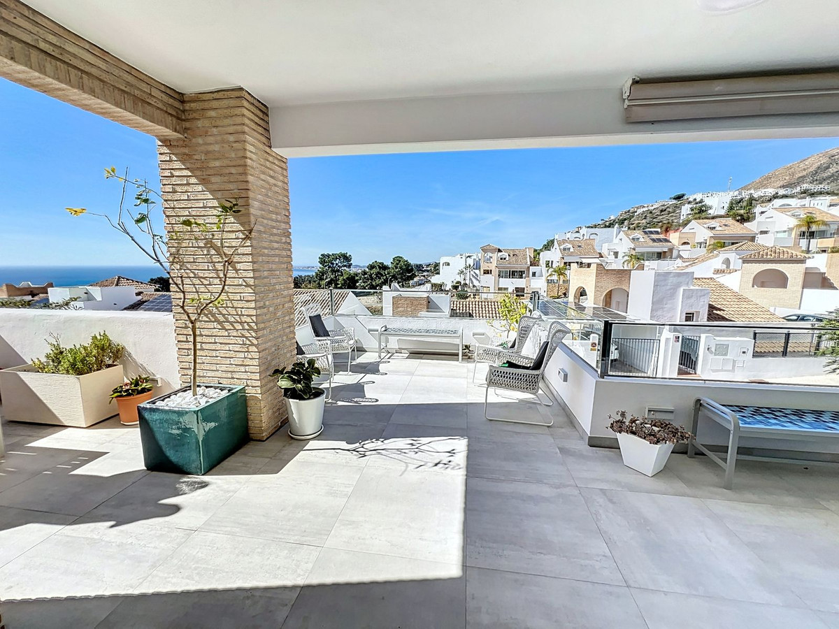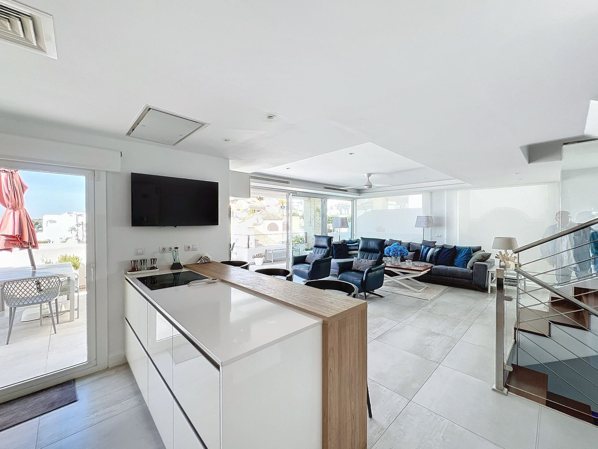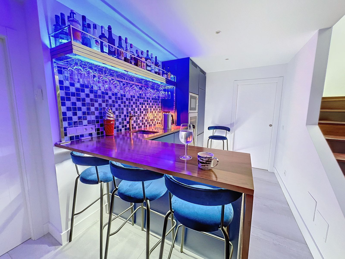 Nestled in the prestigious Big Blue Villas community in Benalmádena, this beautifully renovated villa defines modern coastal living. Spanning three levels, the home offers 3 spacious bedrooms, 3 sleek bathrooms, plus an additional guest toilet – ensuring abundant space and privacy for all. On the ground floor, you'll be greeted by a stylish open-plan living area, featuring a stunning LED-lit bar that sets the perfect ambiance for entertaining, alongside a projector TV for an immersive movie experience. Double doors open out to the terrace, extending your living space and seamlessly blending indoor and outdoor living. The master bedroom, located on this level, is a true retreat, offering a luxurious en-suite bathroom and a large walk-in dressing room. A guest bedroom with its own en-suite ensures comfort and privacy for visitors. On the first floor, you'll find a chic lounge area that flows effortlessly into a modern, fully-equipped open-plan kitchen and dining space. A utility room adds to the convenience. The expansive terrace offers panoramic sea views, creating the ultimate backdrop for relaxation or hosting guests, complete with a built-in bar for alfresco entertaining. The top floor is home to another en-suite guest bedroom, featuring its own private terrace – the perfect spot for unwinding with breathtaking views.