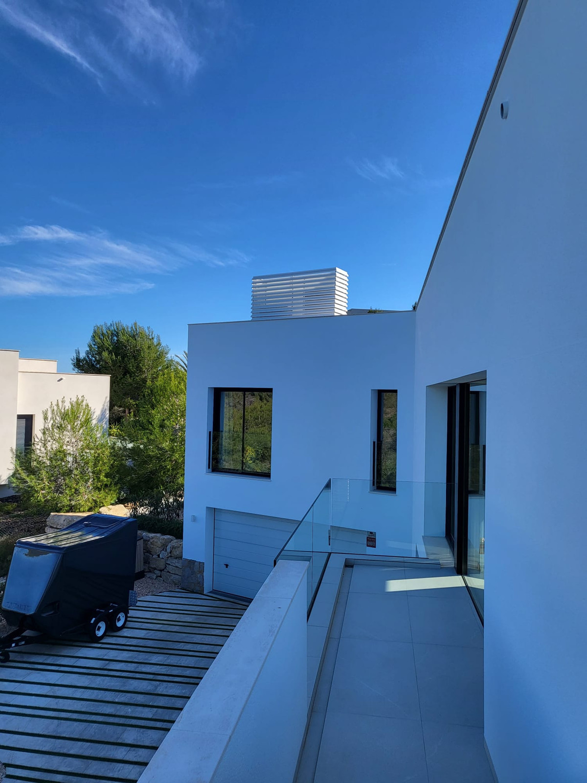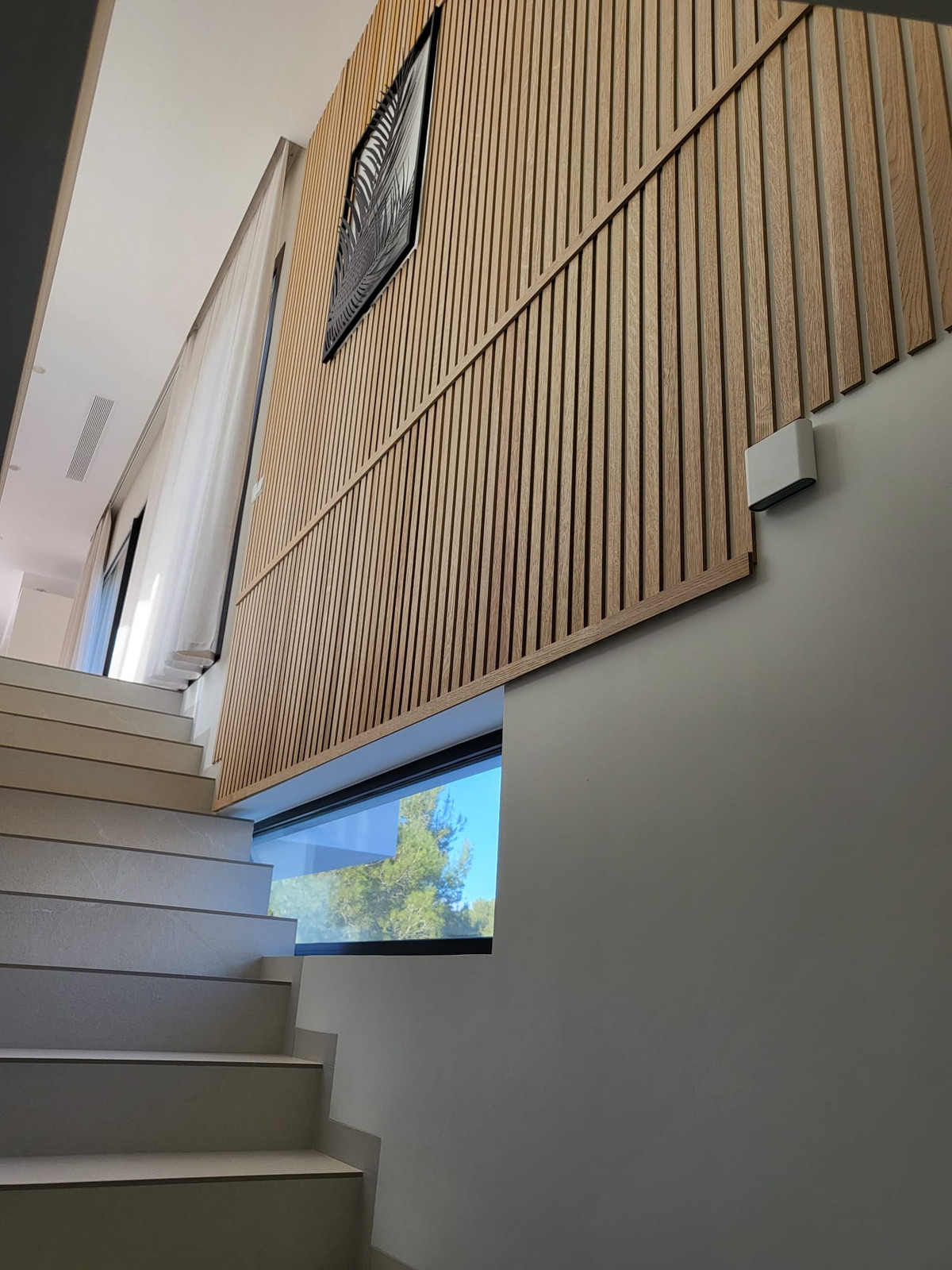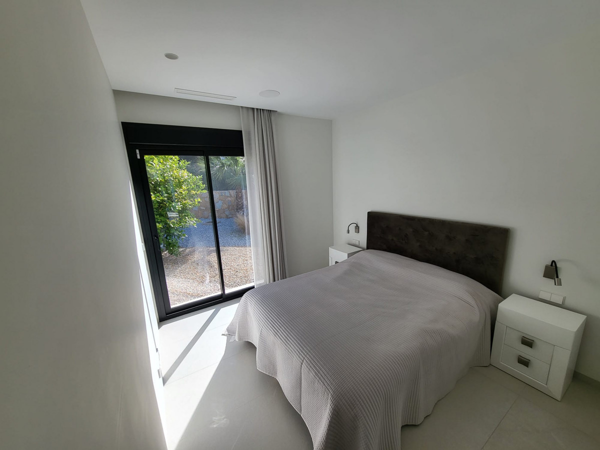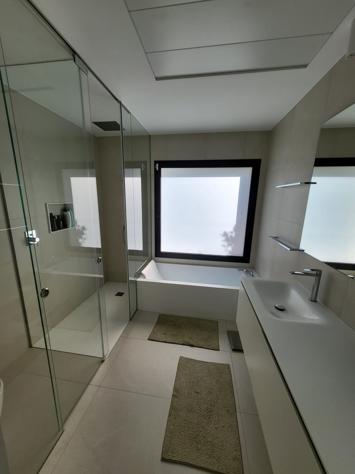 Internally, the Villa presents an open-plan layout seamlessly integrating the kitchen, dining, and living areas, accentuated by expansive full-height windows and doors. Each bedroom offers the convenience of an en-suite, featuring heated flooring in the bathrooms and electric shutters throughout.