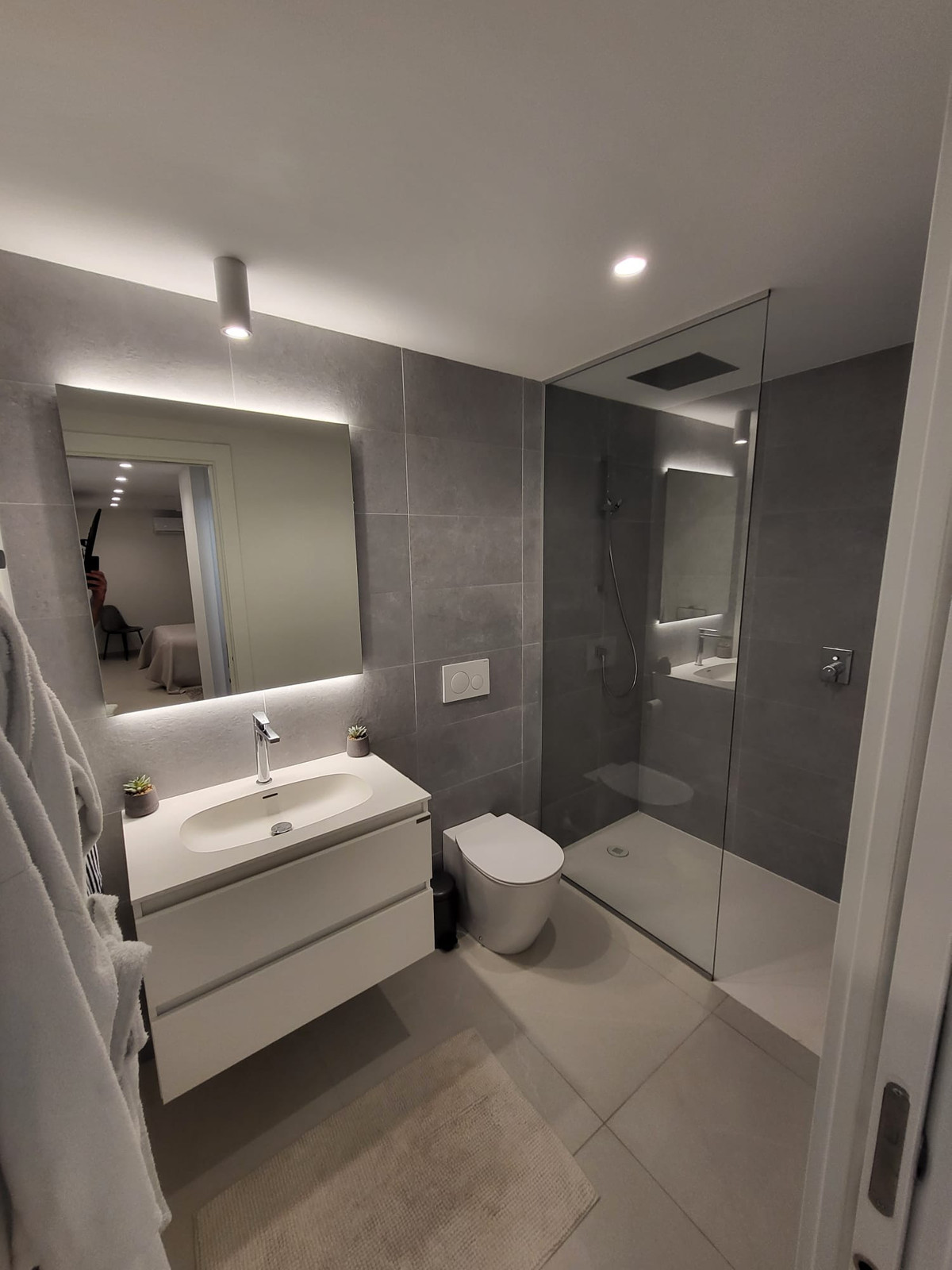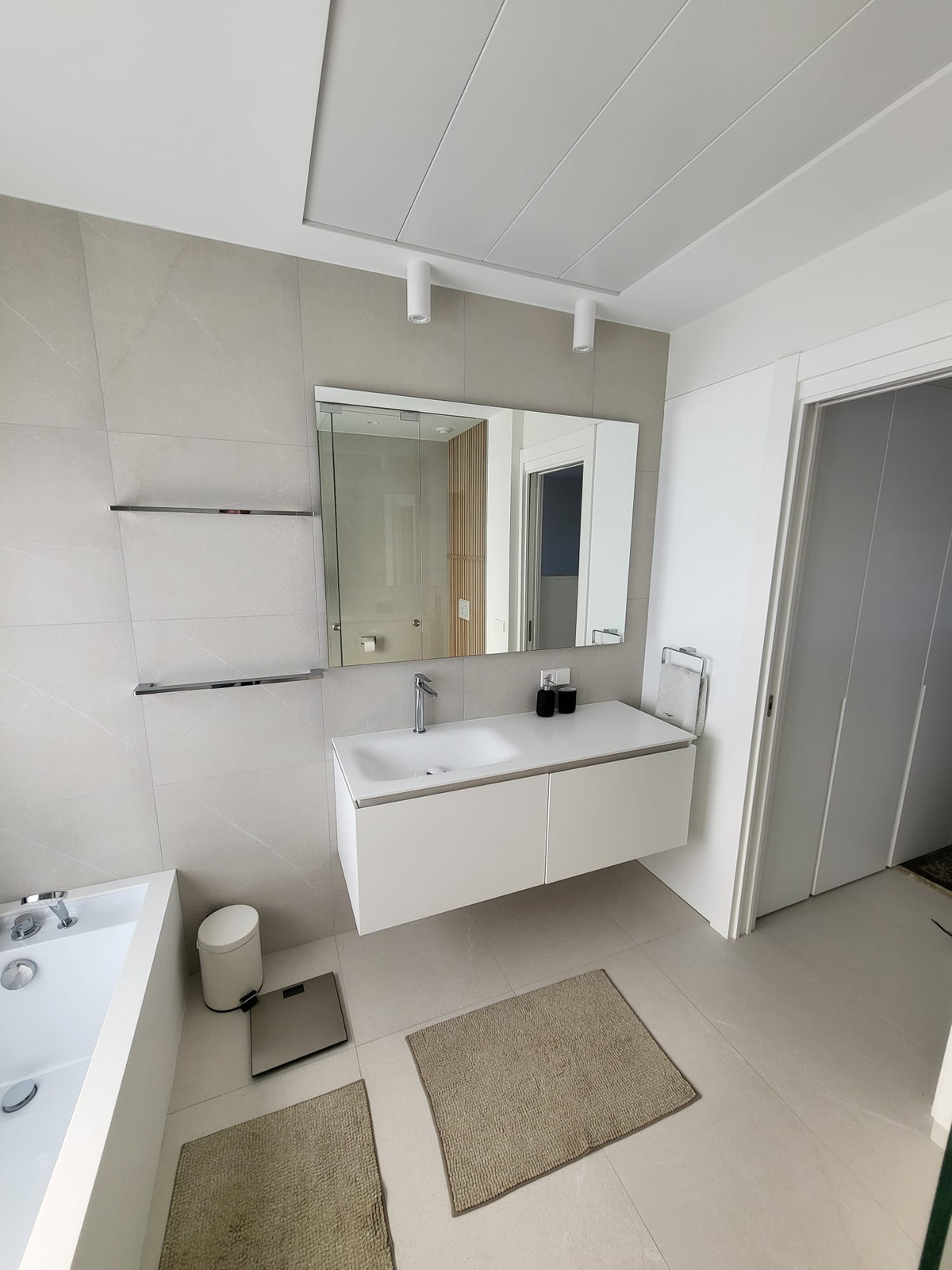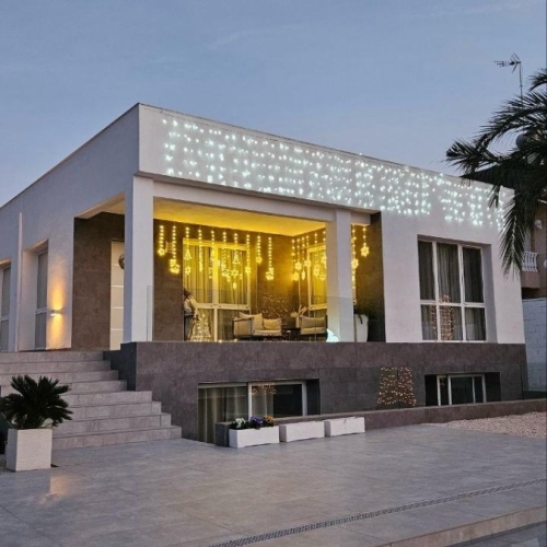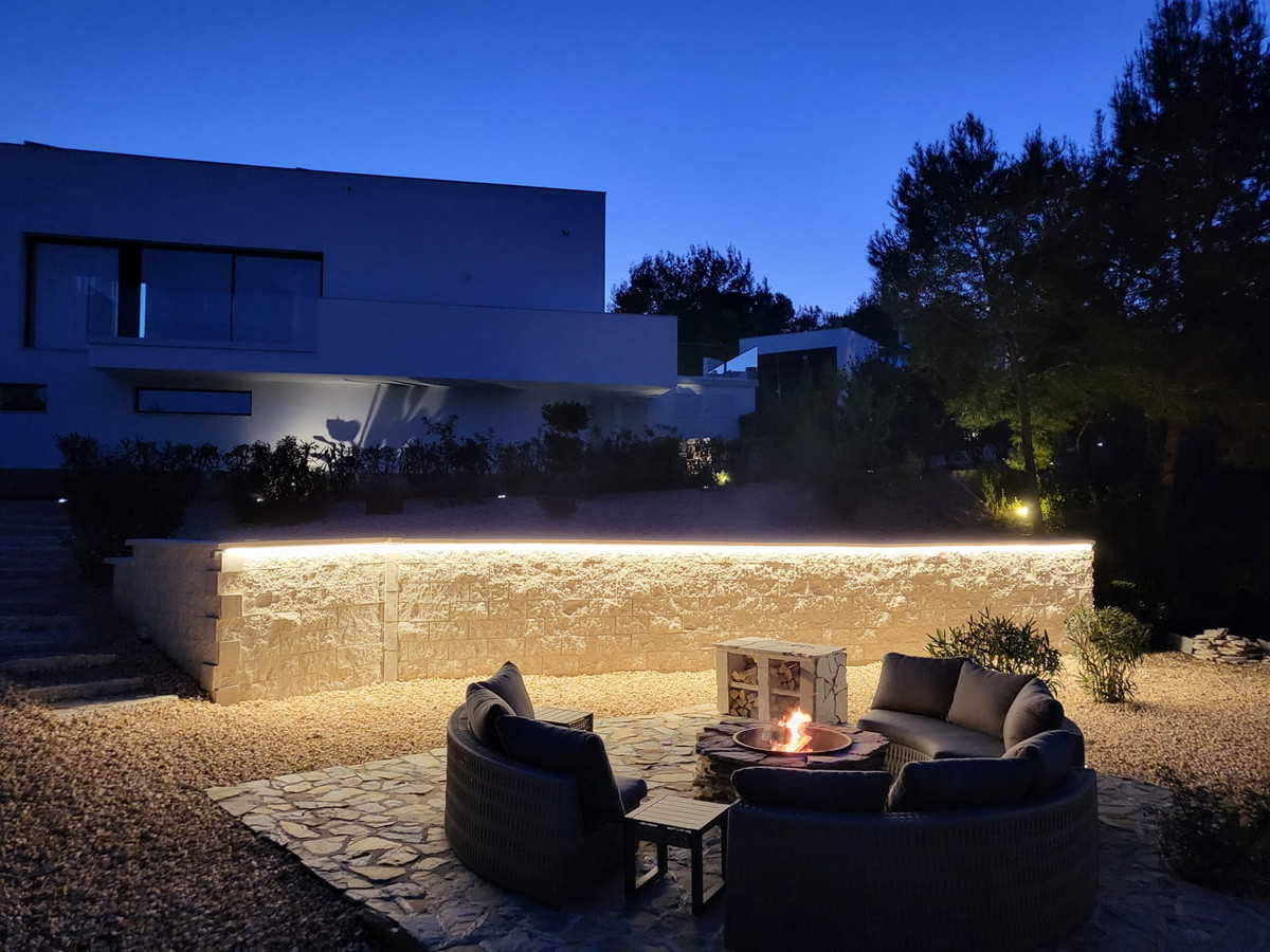 Internally, the Villa presents an open-plan layout seamlessly integrating the kitchen, dining, and living areas, accentuated by expansive full-height windows and doors. Each bedroom offers the convenience of an en-suite, featuring heated flooring in the bathrooms and electric shutters throughout.