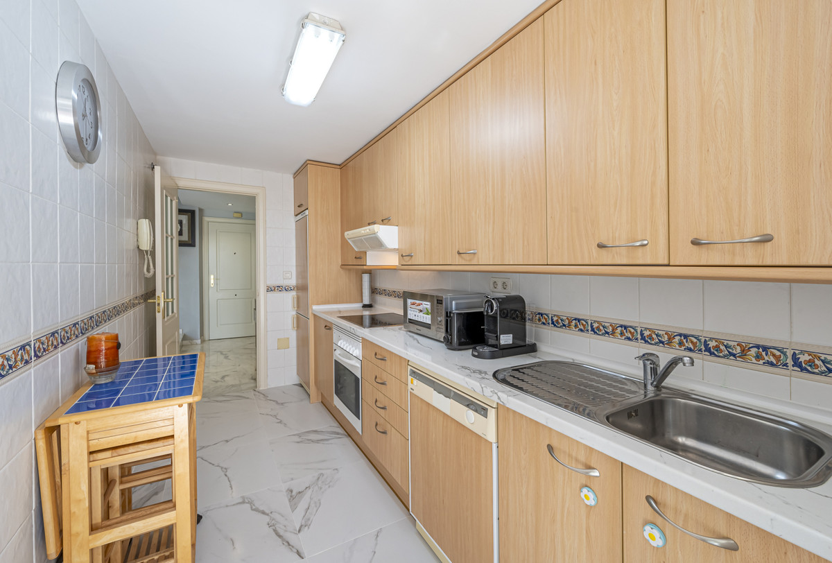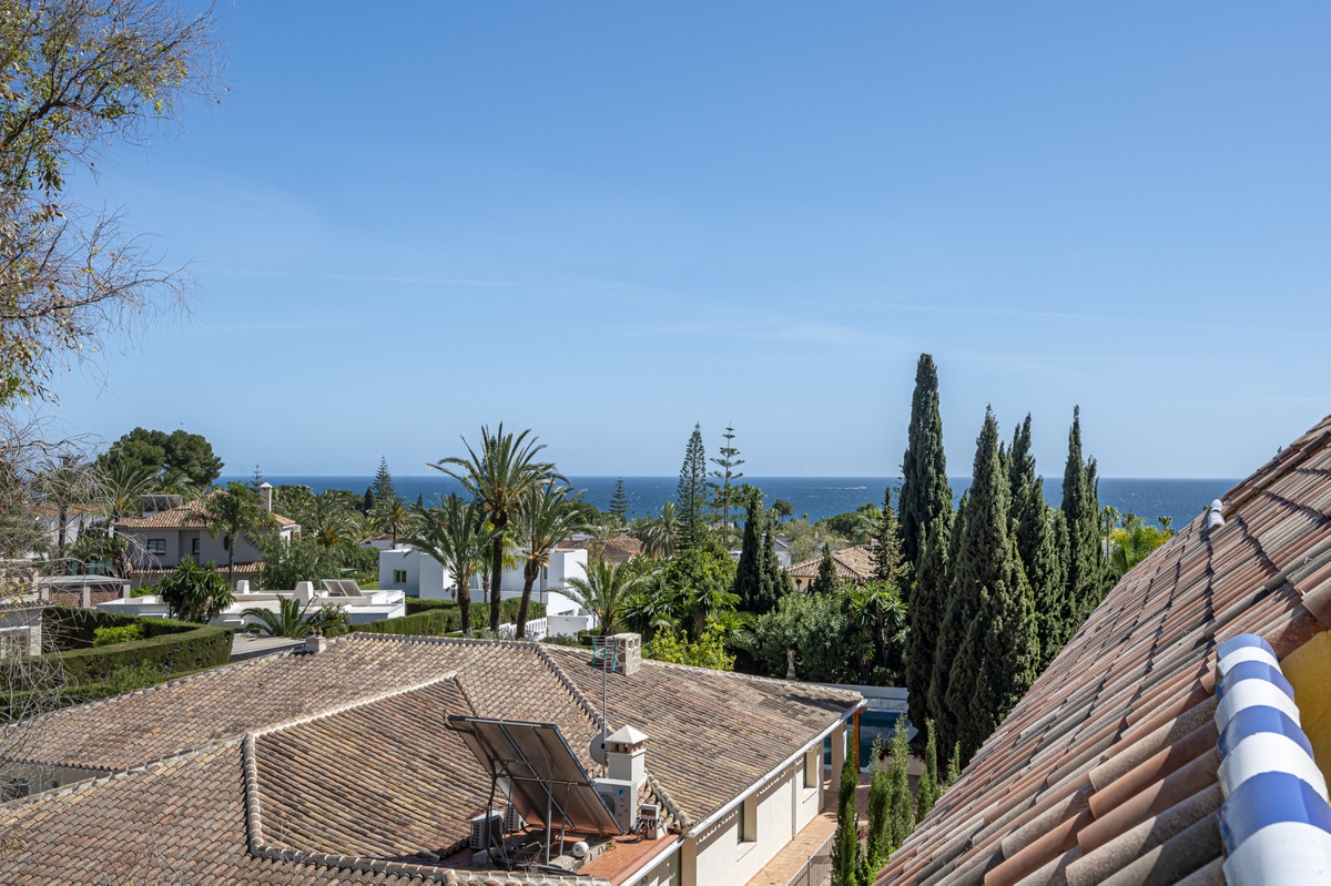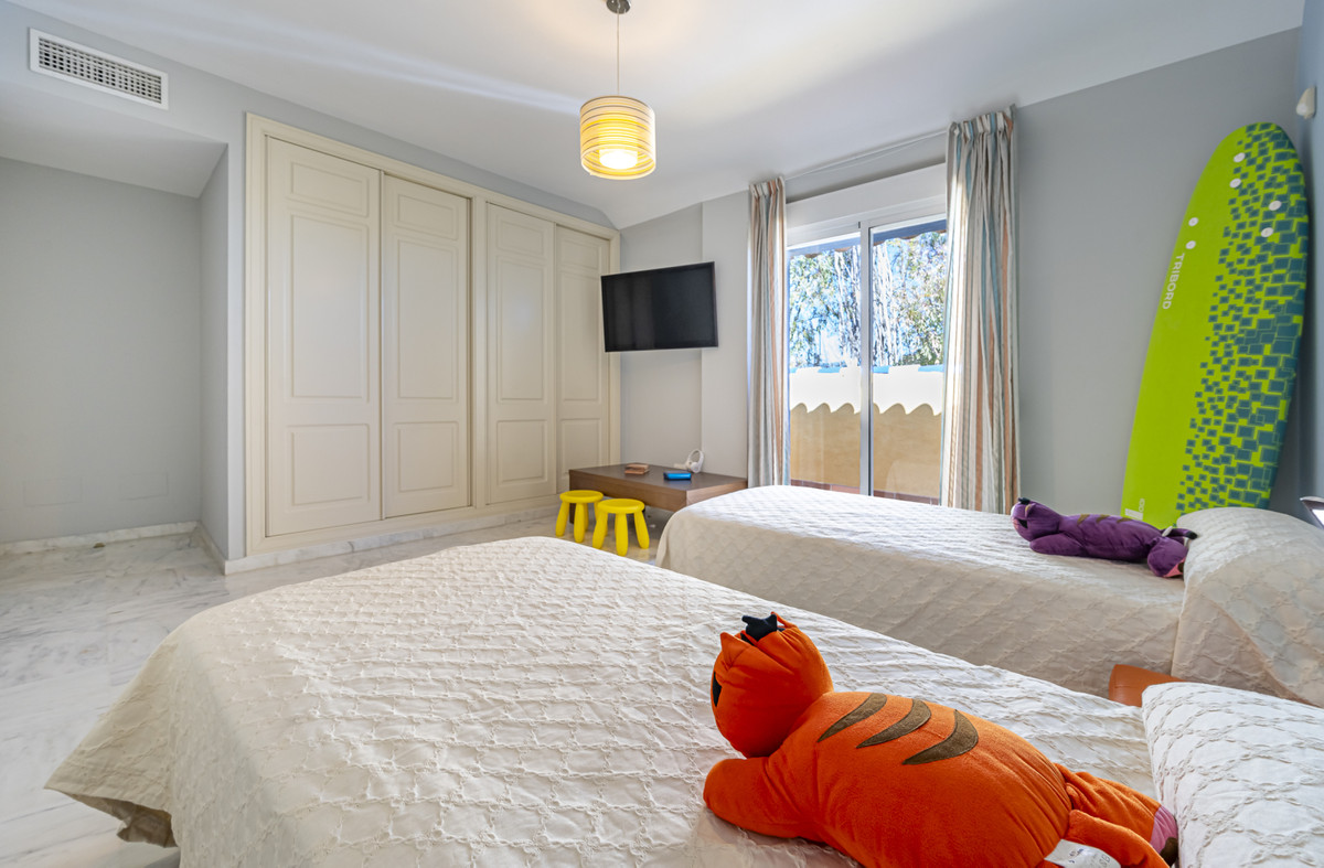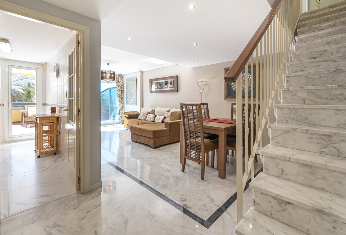 Exclusive opportunity! A stunning duplex penthouse with sea views, just a few steps from the beach in the prestigious Bahia de Marbella. Discover the charm of this property in one of the most privileged areas of Marbella. This property is distributed over two floors and offers an exceptional design and luxury amenities! On the main floor, you are welcomed by a spacious living-dining room that opens onto a sunny terrace overlooking the sea and the gardens, a fully fitted independent kitchen with modern appliances together with a laundry room and a guest toilet, complete this level. On the first floor is the master bedroom with a renovated en-suite bathroom and a private terrace offering stunning sea views, a perfect corner to enjoy the tranquility and beauty of the surroundings. In addition, two spacious bedrooms with fitted wardrobes share another large terrace with open sea and mountain views, along with a modern bathroom equipped with a shower. The property is equipped with hot/cold air conditioning to guarantee comfort at any time of the year. With an unbeatable location in an exclusive urbanisation with communal swimming pools and well maintained gardens. Walking distance to one of the best beaches in Marbella! Total built area: 140,28m2 Year of construction: 2002 Community fees: 220€/ month IBI: 1.200€.