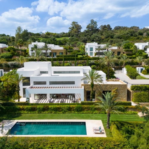 Exuding opulence and refinement, this exceptional villa redefines the very notion of luxury golf resort living. Positioned on an elevated plot, it offers breathtaking panoramic views of the golf course and Mediterranean, while its expansive outdoor areas encompass meticulously manicured gardens and a magnificent swimming pool. Enveloped by lush palm trees and abundant flora, this residence provides an exquisite outdoor sanctuary for year-round enjoyment. Bathed in natural light, thanks to an abundance of floor-to-ceiling glass doors, the ground floor seamlessly connects to the garden, fostering a harmonious indoor-outdoor flow. The property is distributed over 3 floors, with a basement housing a laundry room, facility room and bespoke wine cellar. Access to the basement was cleverly integrated to the property through a hidden cylindrical door. The interior spaces are elegantly designed, located on the ground floor level - features neutral soft tones and unique materials that imbue the home with an unparalleled sense of individuality. The kitchen, equipped with top-of-the-line Gaggenau appliances, showcases bespoke cabinetry and a stylish kitchen island, while the light wooden flooring throughout the house evokes a serene and tranquil ambiance. The property's manicured landscapes, carefully curated within its boundaries, create a captivating backdrop visible from the ground floor. The upper level is dedicated to the bedrooms, each with its own private terrace and separated by stunning white dividers. The architectural prowess of Vicens & Ramos is evident from every angle, with the property's impressive entrance leaving a lasting impression on all who arrive. With its privileged frontline golf position, awe-inspiring views and an unwavering commitment to excellence, this masterpiece stands as a truly incomparable residence within the exclusive Finca Cortesin Resort.