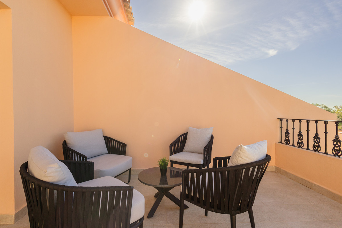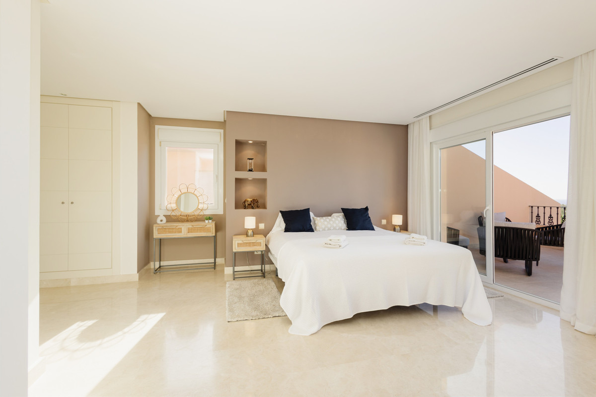 The spacious master bedroom with its en-suite bathroom is located on the second floor. It also has access to a private terrace with panoramic sea views and features 1 sun lounger and 2 armchairs, perfect for relaxation.