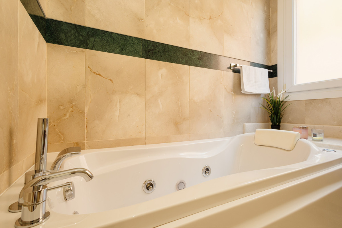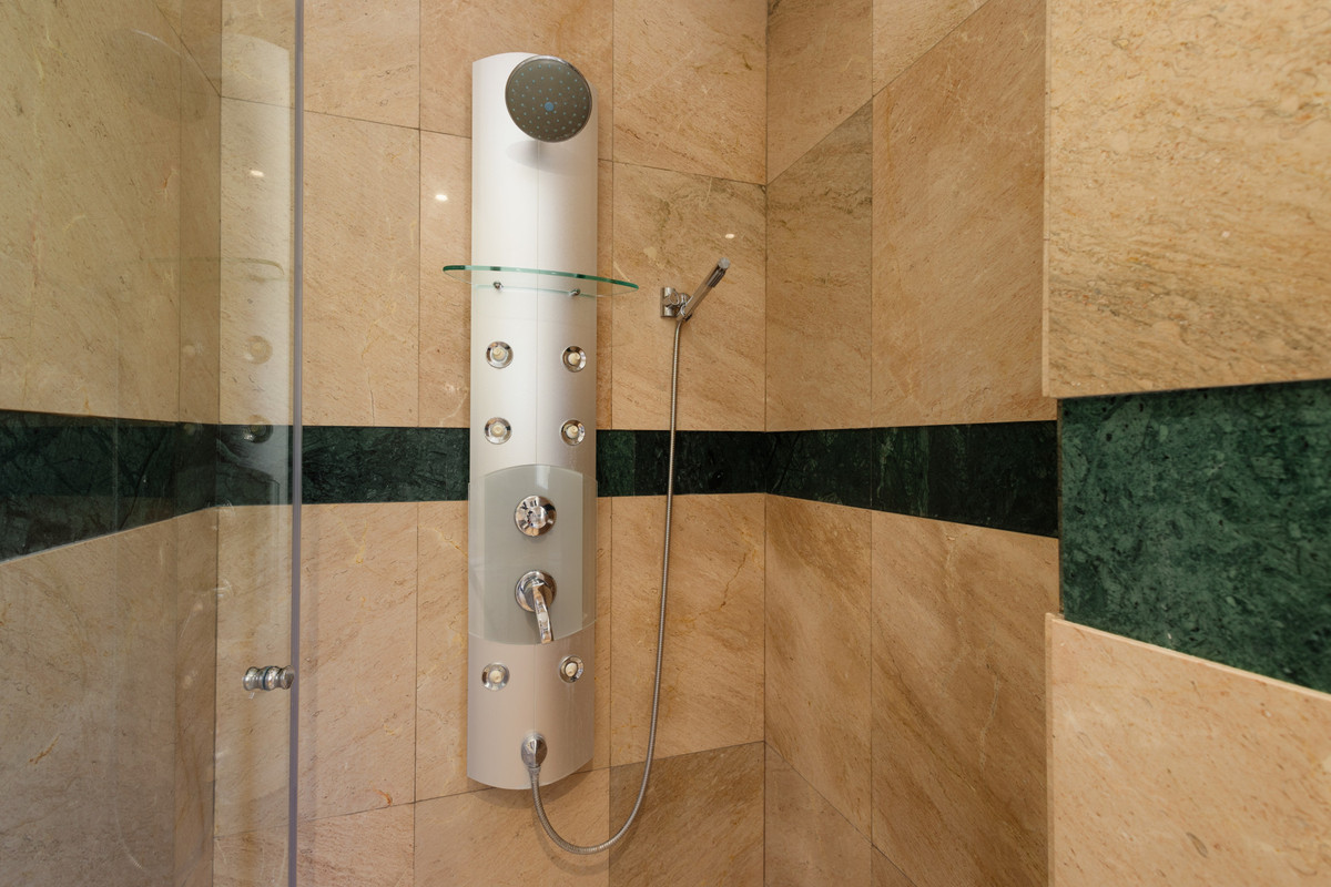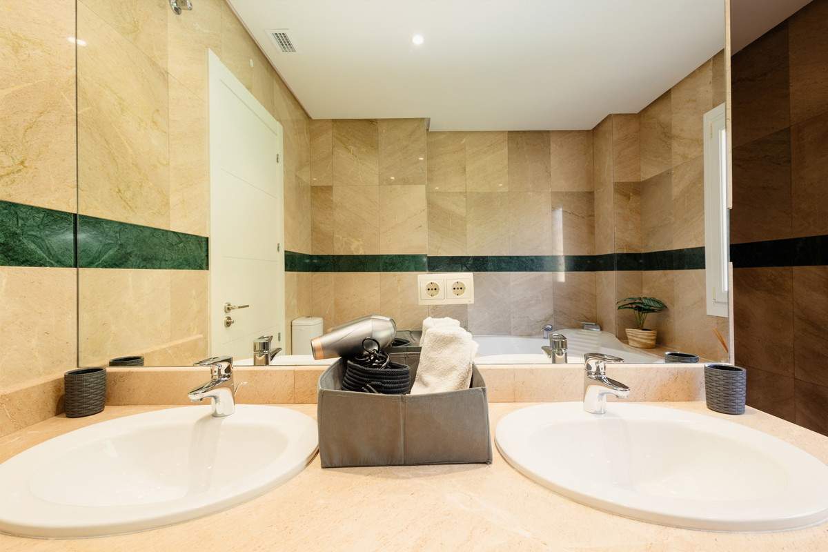 The 3 bedrooms are furnished with high-quality beds: two with king-size beds and one with a queen-size bed, all with en-suite bathrooms featuring a rain shower, bathtub, and double sink.