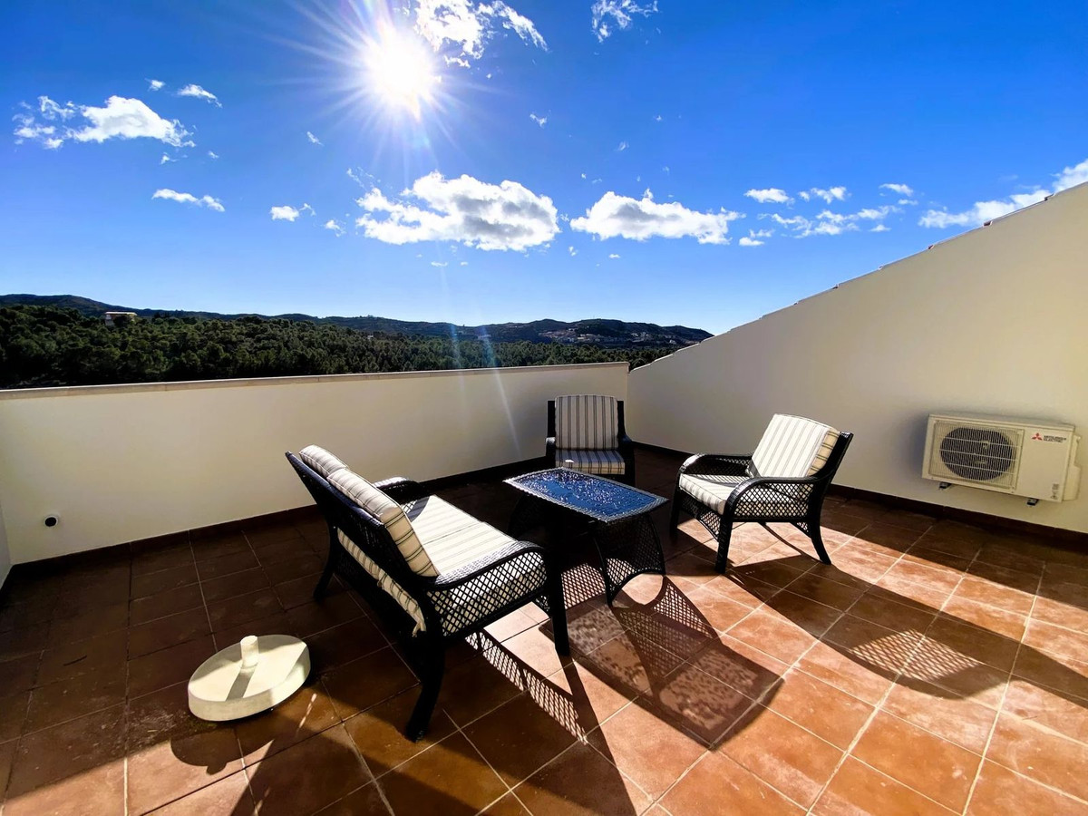 The main level features a generously proportioned living area adorned with lofty ceilings and a newly equipped open-plan kitchen. Floor-to-ceiling windows ensure panoramic views of the terrace and the surrounding natural splendor. The expansive master suite, complete with an en-suite bathroom boasting both a shower and a bath, opens onto the terrace. An additional bedroom with an en-suite bathroom, a guest toilet, and ample storage space complete this level. Step onto the spacious terrace to bask in the serenity, complete with an inviting infinity pool and multiple seating areas.