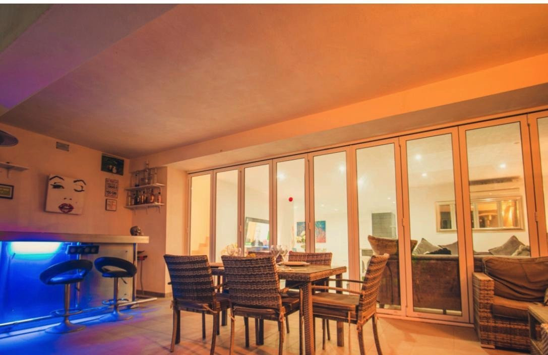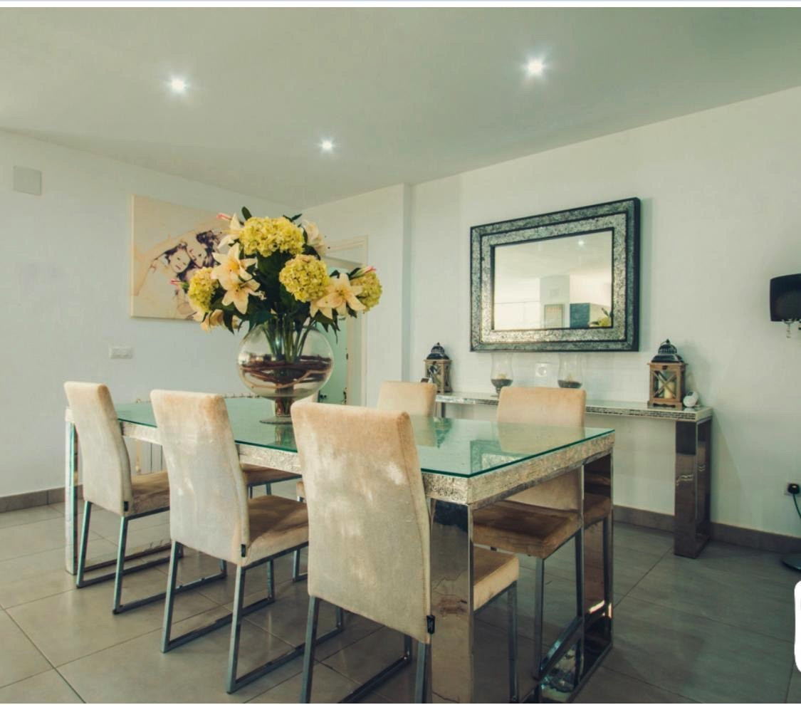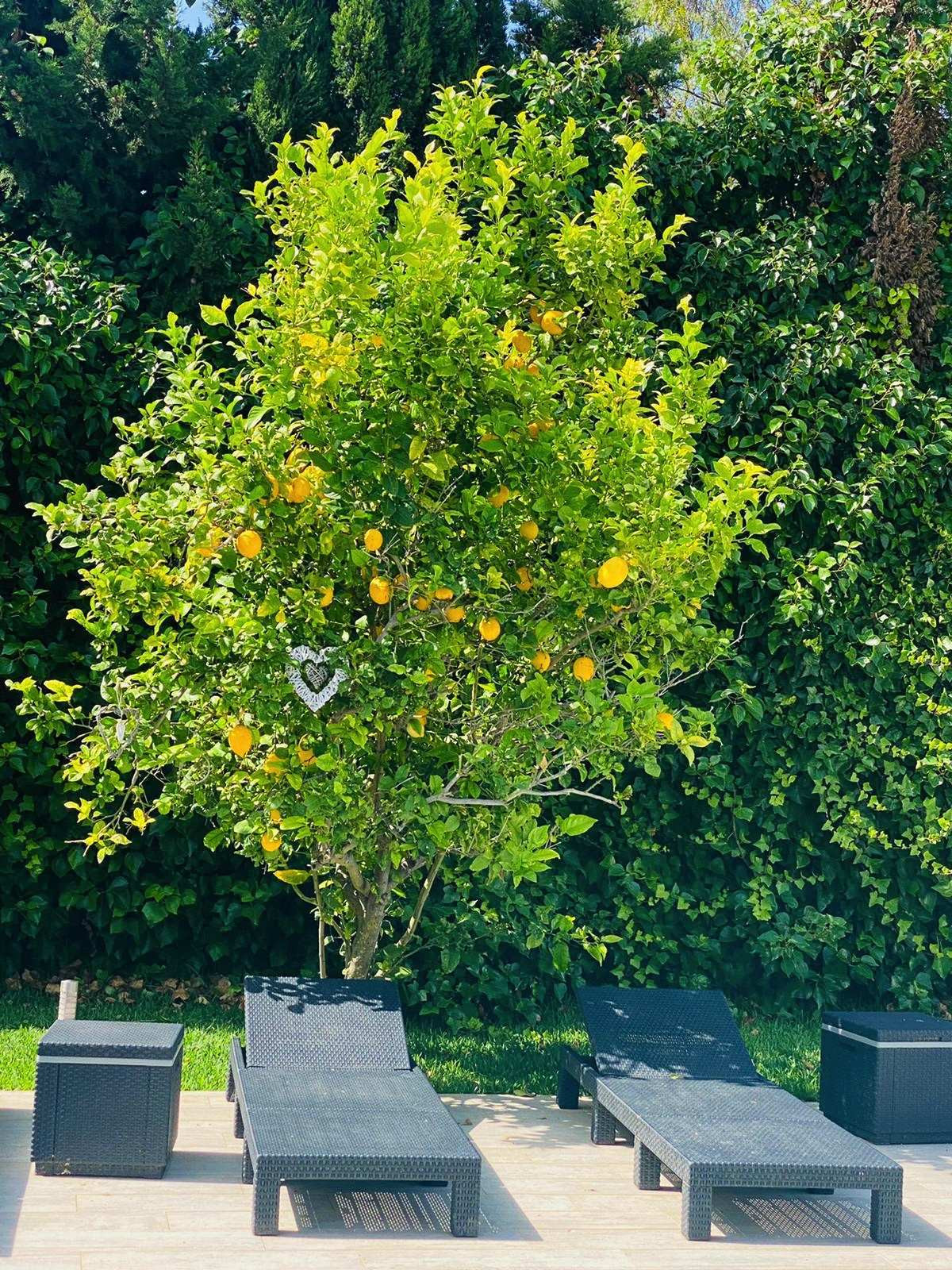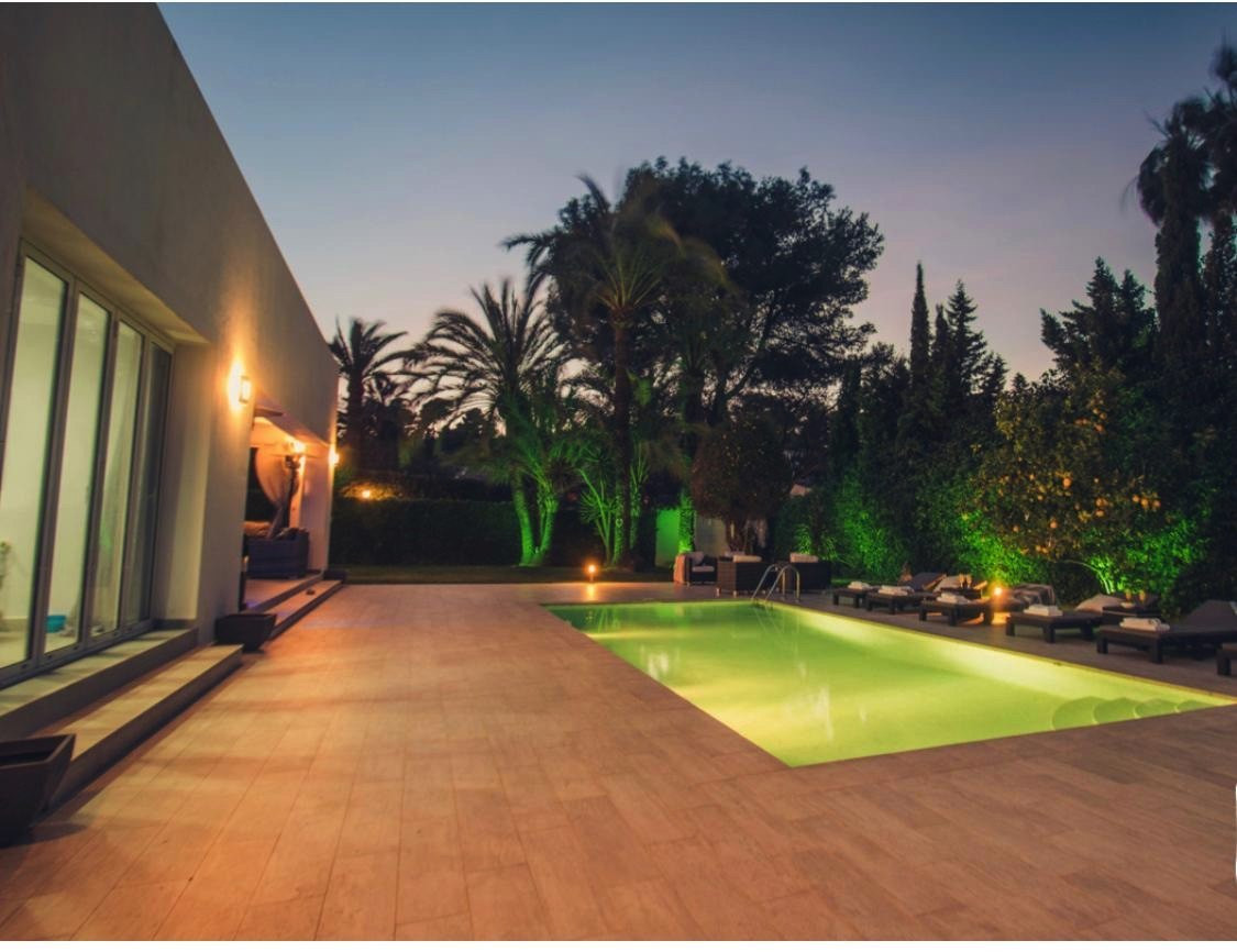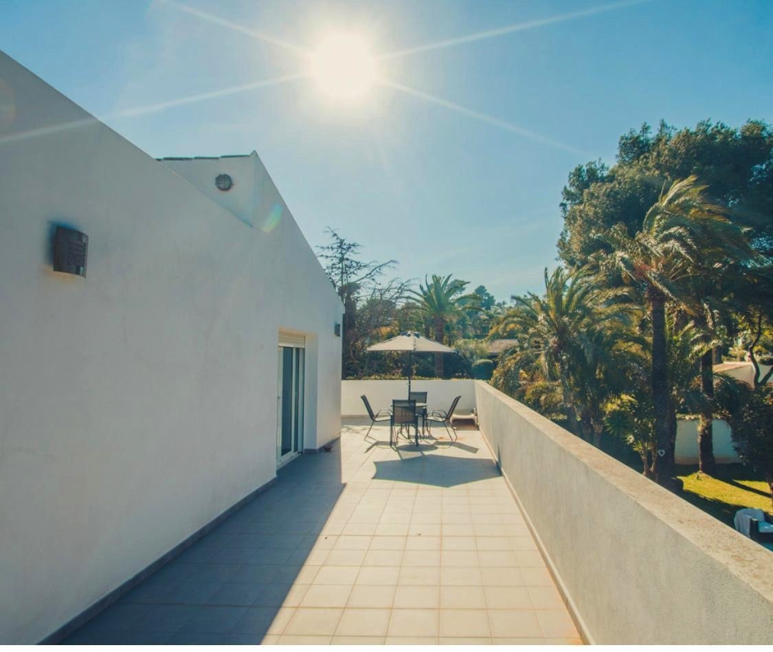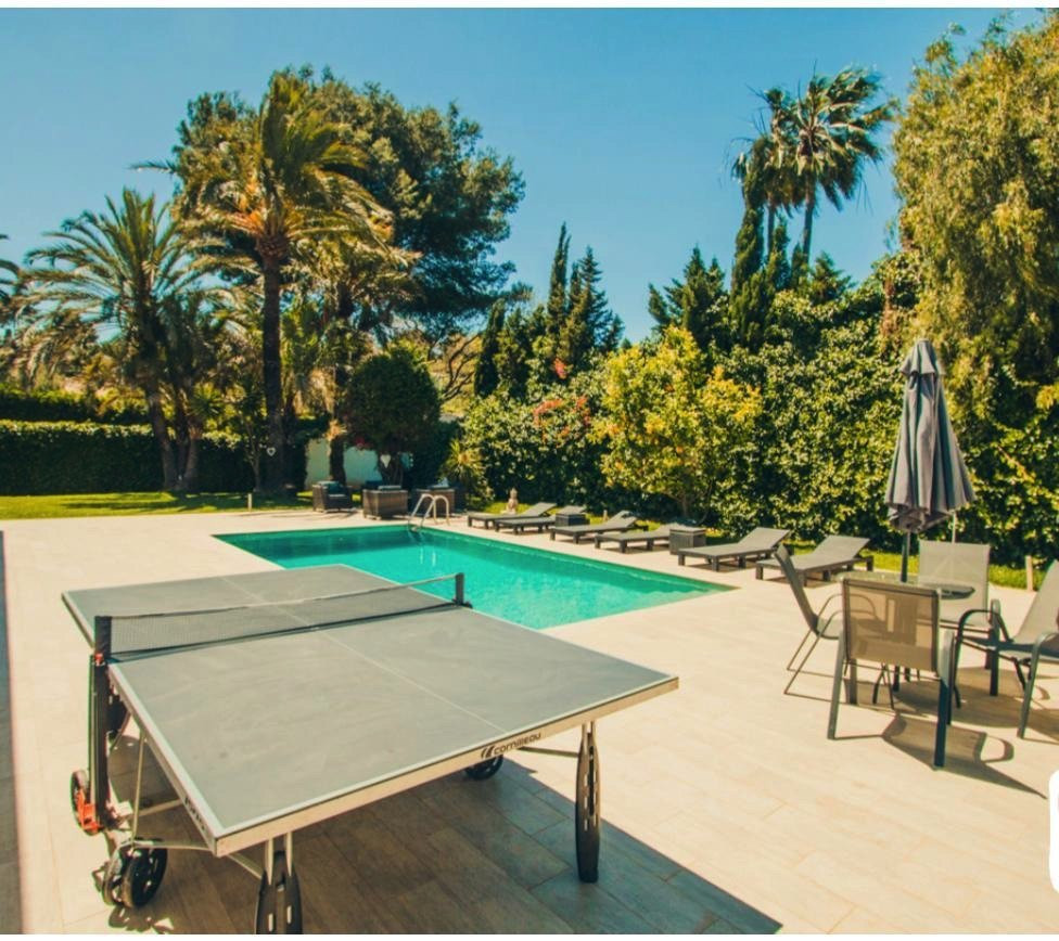 EXTERIOR: The garden of the villa is full of plants and lemon trees . The pool is located in the middle of the garden and is surrounded by hammocks to enjoy the good Mediterranean climate. Under the porch, we find an outdoor dining table with table and chairs, as well as a bar where we can serve refreshments in summer. In addition, we also have a small chill out area with a sofa and two armchairs where we can relax on our vacations. Thus, another chill out area is located next to the pool with enough capacity for all the guests of the villa. In the other part of the accommodation there is a trampoline as well as a space to exercise outdoors. The villa is located in a quiet residential area.