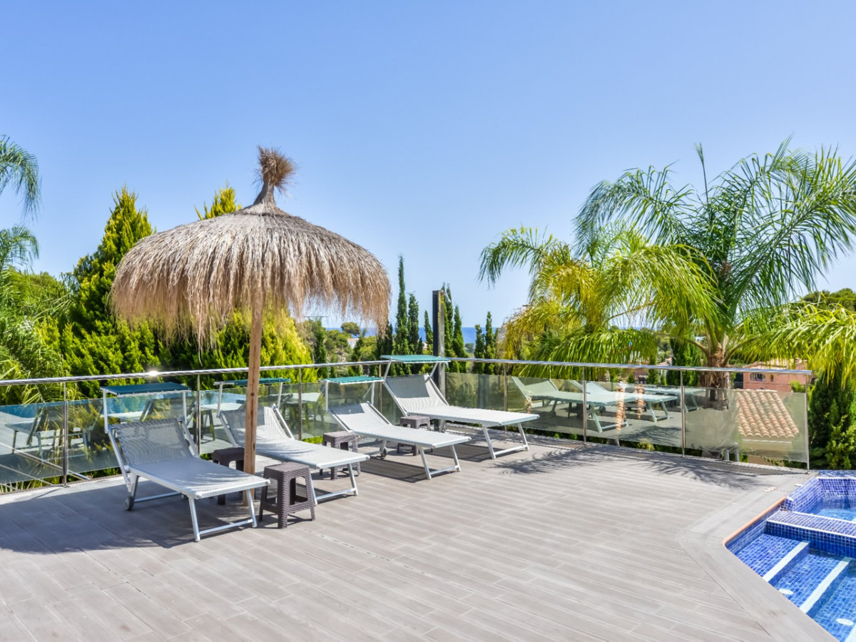 Big luxury villa for sale in La Fustera, situated just 1,3 Km from the beautiful La Fustera Beach, supermarket, restaurants, bus stop..., very close to Moraira and Calpe. This wonderful modern mediterranean style villa enjoys very nice sea views, plenty of sun (South facing) and maximum privacy. It is located on a superb plot of 1.840 m2 and has a constructed area of 585 m2, distributed over two floors + basement floor as follows: on the main floor we have the entrance porch, a fabulous 25 m2 hall with a beautiful double staircase that accesses the upper floor, an indoor spa and relaxation area with a 6x3 meters heated pool + jacuzzi + waterfall, sauna for 6 people, 25 m2 gym and 1 toilet, large 15 m2 laundry pantry, 30 m2 dining kitchen with island, fabulous dining living room of 75 m2 (with designer fireplace), and 50 m2 porch (perfectly equipped with a summer kitchen), which merges with the 100 m2 exterior terrace where we have a wonderful 70 m2 heated pool. Integrated into the garden, we also have a barbecue area that communicates with the exterior terrace. On the upper floor we have 5 large bedrooms (25 m2 + 20 m2 + 18 m2 + 18 m2 + 12 m2), 4 bathrooms en suite, a dressing room and 2 private terraces (80 m2 + 25 m2). In the basement floor we have a party room (with bar) of 40 m2 (with natural light through an English patio), 1 courtesy toilet, guest apartment (also with access from the outside), consisting of 1 bathroom, 1 bedroom of 12 m2 and open plan kitchen dining living room of 25 m2. In addition, on this floor we have an open space of 110 m2 not developed that offers a multitude of expansion options for this property. This impressive villa stands out for its beautiful design, for its exclusive materials and for its top quality finishes. It is equipped with underfloor heating and air conditioning, high end exterior carpentry, designer interior carpentry, designer kitchen fully equipped with Smeg appliances, designer bathrooms, alarm + cameras, LED lighting... In addition, it enjoys large exterior parking areas for several vehicles and an impressive 50 m2 pergola (for 3 vehicles, which could easily be converted into a garage), located next to the main entrance of the property. The garden is spectacular, with large grass areas, beautiful palm trees and is low maintenance (with automatic irrigation system).