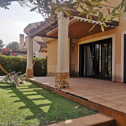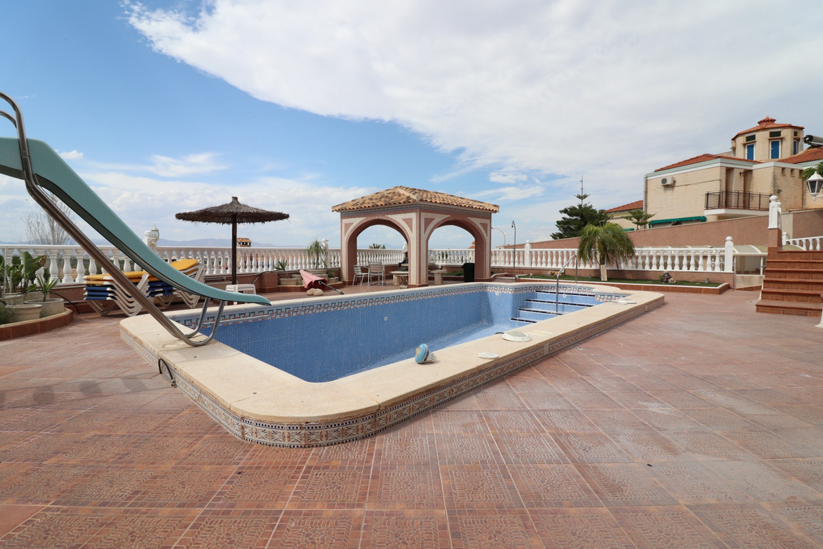 FANTASTIC OPPORTUNITY!!! - This Extremely Spacious, West Facing, Four Bedroom Detached Villa in Lomas de La Juliana is located on a prestigious Urbanization between Algorfa Village & La Finca Golf Resort, situated on a generous 1251m2 plot. This stunning property features four bedrooms and three bathrooms, including a luxurious master bedroom with an en suite bathroom that boasts a feature corner bath and shower. Both the master and the fourth bedroom have direct access to the first-floor terrace. Additionally, there is one toilet, off-road parking, a car port, and a garage. The villa offers a front glazed terrace where you can enjoy amazing panoramic country, mountain, and sunset views. The rear conservatory provides additional living space, while the open plan fully fitted kitchen comes with an adjoining utility room for added convenience. The spacious living area is equipped with air conditioning throughout, grills, a fireplace, and fitted wardrobes for ample storage. The exterior of the property is just as impressive, featuring a private heated swimming pool and a permanent gazebo for outdoor shaded dining, perfect for entertaining guests. There is also a BBQ area and a beautifully landscaped rear garden with terraces, trees, shrubs, and plants. The property includes 8 solar panels and 1 solar water panel, contributing to its energy efficiency. Security is a priority with CCTV and an alarm system installed. This villa's location offers the best of both worlds – a tranquil setting with a tennis club at the start of the urbanization, yet only a 5-minute drive to the nearest shops and amenities, and a 15-minute drive to the nearest beaches. This property truly represents a luxurious lifestyle in the heart of Costa Blanca South. 412m2 Build Size, Simply Wow!!!\n