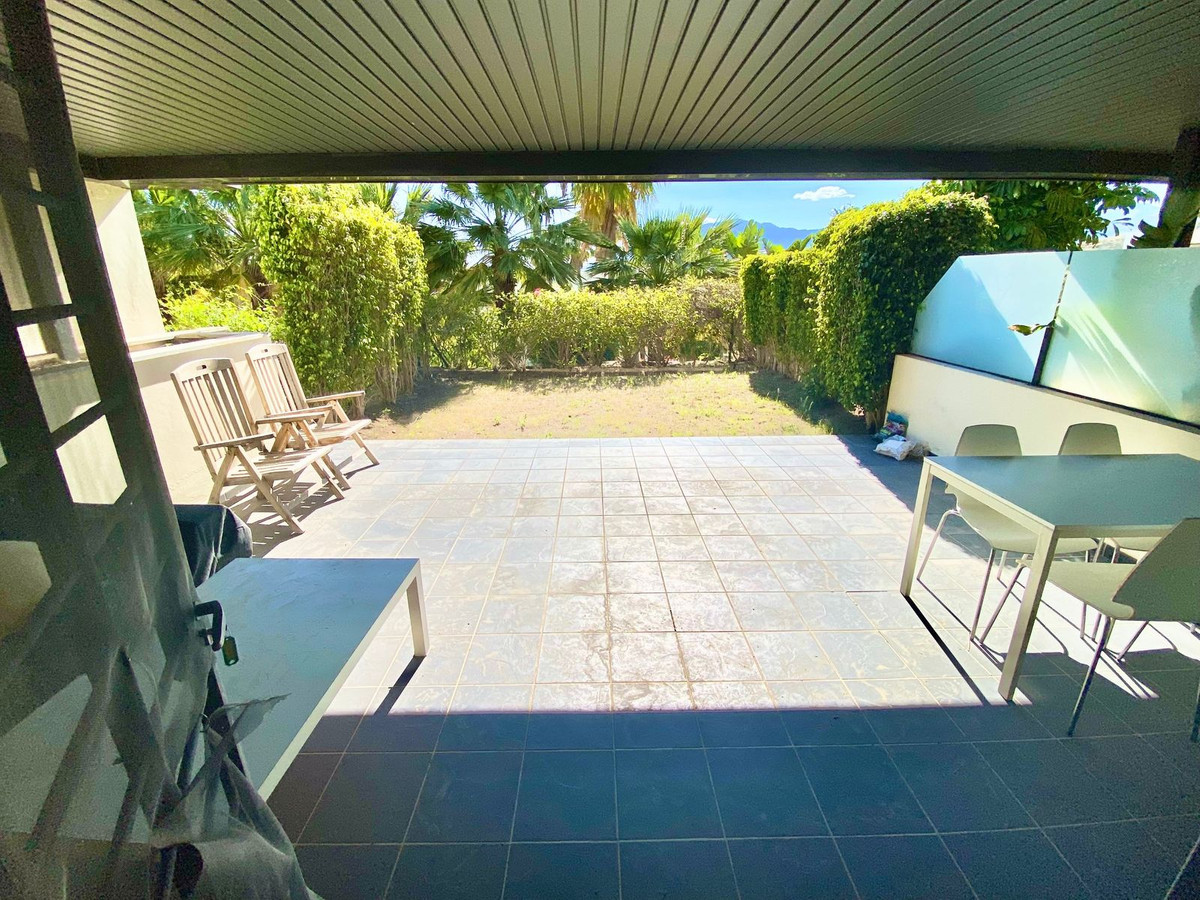 Elevated ground floor unit with fabulous terrace and garden space! The spacious back plot is facing southeast, and the front terrace and garden is facing southwest (with garden, mountain and a bit of sea view), so you always have areas with sun and shade, perfect to use all year. Access is easy, suitable for elderly, families with children, or pets. The inside is in good condition and of good layout, with the living areas separated from the sleeping areas. Good size bedrooms and bathrooms. Big walk-it closet, could be converted into a third bedroom. The apartment comes with 2 underground private parking spots, and a big storage room.The urbanisation is state of the art, with several swimming pools, beautiful garden with patio green, and 24h security. A must see!