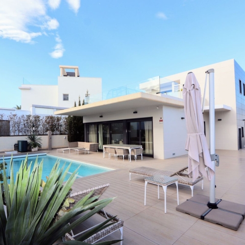 We offer for sale a luxury villa near the sea in one of the best areas of the Costa Blanca - Campoamor.Exquisite villa on a plot of 1000 sq.m. surrounded by a well-maintained garden with Mediterranean plants, there is also a large swimming pool, a small lounge area for relaxing with family or friends and many other cozy corners to enjoy the mild Spanish climate. There is a garage also.Spacious house with a total area of 200 sq.m. Thanks to its good location, panoramic windows and the use of soft, noble tones in the decoration of most rooms, the villa is filled with sunlight all year round.Villa consists of a large, fully equipped closed kitchen with access to the garden and to a spacious living-dining room, an office, 4 bedrooms and 2 bathrooms. Individual gas heating, underfloor heating in bathrooms and kitchen. There is a large dressing room. The design of each room is decorated in an aristocratic style, so this is an ideal option for those who appreciate comfort, privacy and luxury.The villa is located in an elite gated urbanization, which is surrounded by pine plantations. Also on the territory of the complex there is a communal pool, common recreation areas, a tennis court, and for lovers of natural products there is a great opportunity to order delicious milk and freshly baked bread from local farmers.The Campoamor is one of the best areas on the Costa Blanca. Gorgeous sandy beaches within walking distance, the presence of many bars, restaurants, shops, pharmacies nearby, the Royal Yacht Club, a horseback riding school and best golf courses - an excellent place for both living all year round and for holidays.