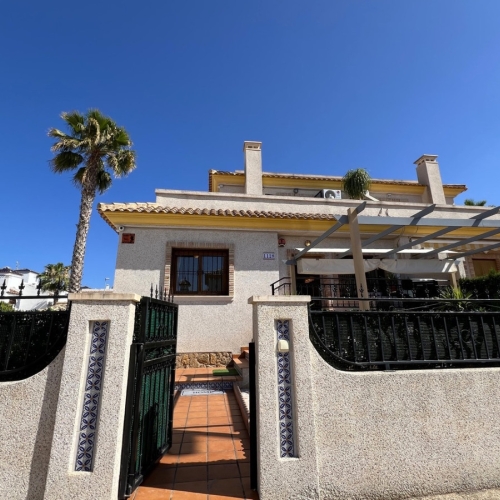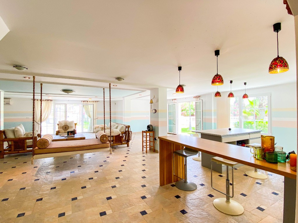 Luxury villa for sale on the golf courses of the Costa Blanca.We are glad to present you an exclusive villa with a well- maintained plot, a garden and a swimming pool near the sandy beaches of Orihuela Costa, in a quiet and very picturesque area, surrounded by pine groves and the famous golf courses of Villamartin and Campoamor.The house is built on two levels with isolated entrances, which allows it to be used for whole-year-living and for commercial purposes as well.Each level has its own exit to the well-maintained garden with palm trees. On a plot of 3000 sq.m. there are the swimming pool, sport courts, a barbeque area and a private garage.The villa is equipped with air conditioners, built-in appliances, underfloor heating in bathrooms, a security alarm system and video survelliance.On the ground level you will see a huge salon with panoramic windows and access to the garden. There are also 2 bedrooms, kitchen and bathrooms.On the next level there are a living room with a fireplace, a dining room with a built-in kitchen, 4 bedrooms and 3 bathrooms. This level is surrounded by a panoramic terrace.This house is full of light and warmth and only modern materials of high quality are used in the decoration of the villa.The house is located only in 5 minutes of driving from golf courses and in 10 minutes from the best beaches of the coast. This area has a well-developed infrastructure: shops, supermarkets, schools, bars and restaurants, hotels – all these things are nearby. Alicante and Murcia International Airports are in 45 minutes by car.This amazing villa is a unique offer of price and quality. If you decide to buy this house, you are choosing a comfort and a special lifestyle on the Mediterranean coast of Spain.