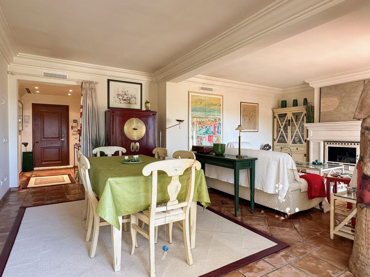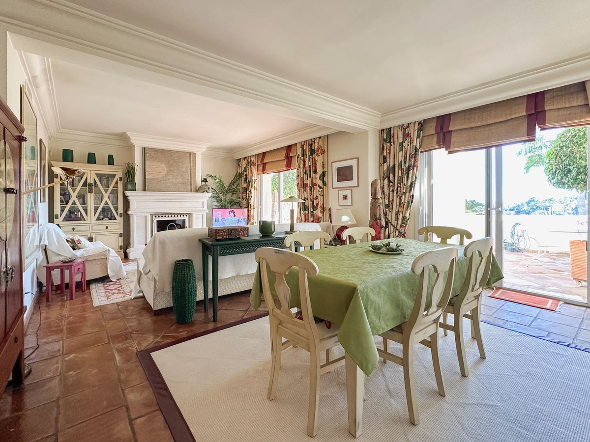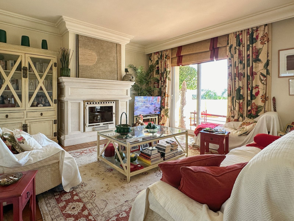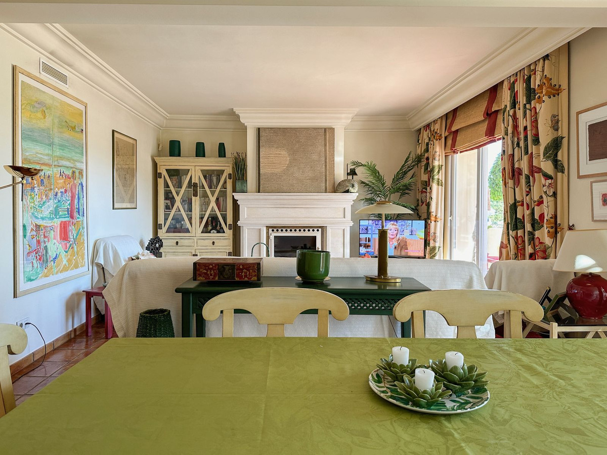 The main south-facing terrace is accessible from the spacious living and dining room with fireplace, an exquisite space with unparalleled panoramic views of the fascinating golf course and the Mediterranean Sea.