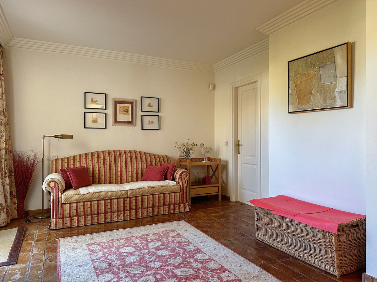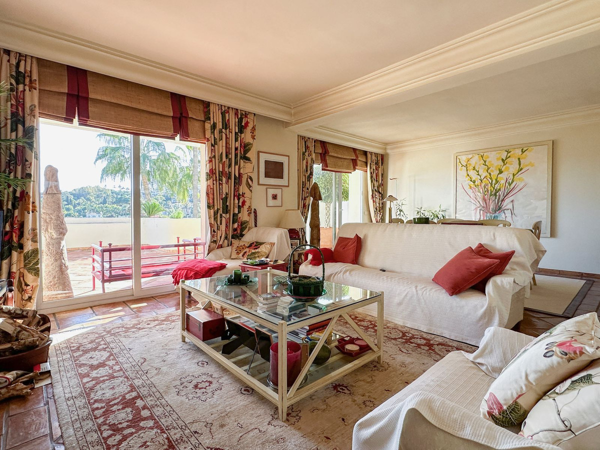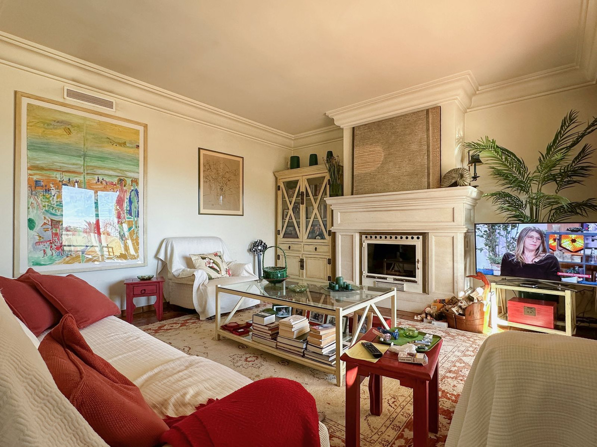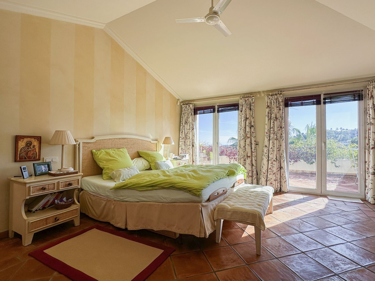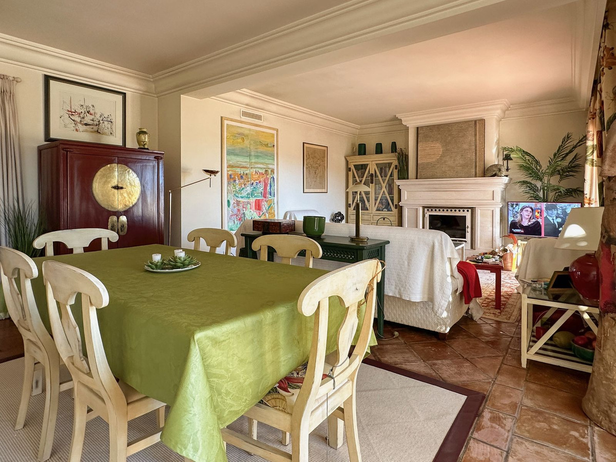 The main south-facing terrace is accessible from the spacious living and dining room with fireplace, an exquisite space with unparalleled panoramic views of the fascinating golf course and the Mediterranean Sea.