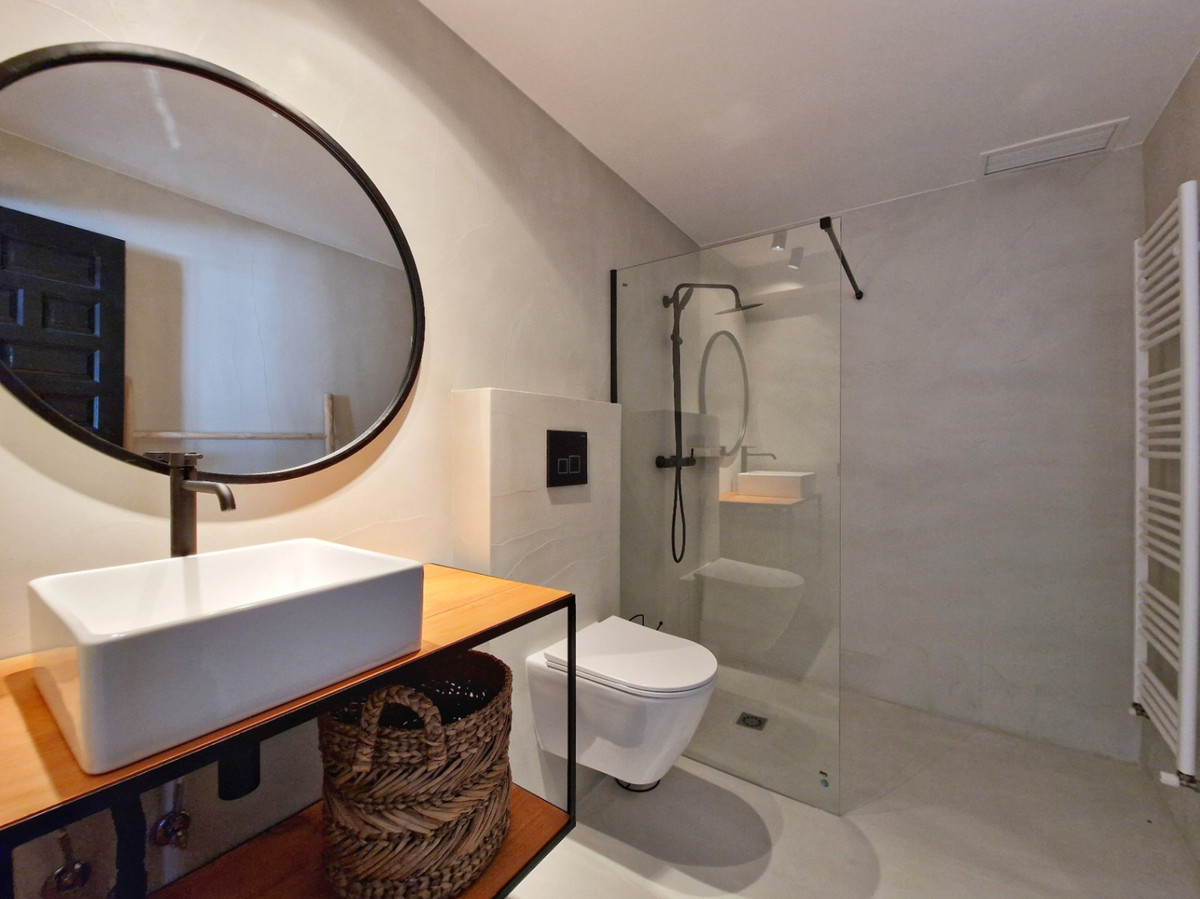The villa features four spacious en-suite bedrooms, all located on the main floor and designed to offer maximum comfort and privacy. Each of these bedrooms is equipped with microcement floors, creating an elegant and modern continuity throughout the house. The brightness and careful design of these rooms ensure a perfect retreat for rest and relaxation.