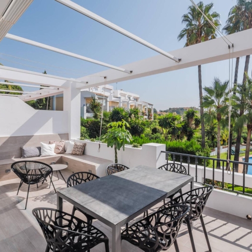 Welcome to your perfect oasis in Capanes del Golf, a luxurious Andalucian style development nestled within the prestigious El Higueral Golf Course in Benahavís. This modern and beautifully furnished duplex penthouse offers an exceptional living experience, featuring 3 bedrooms, 2 bathrooms, and 1 WC. With a south-west orientation, you'll enjoy breathtaking views of the lush tropical gardens and the magnificent golf course.
