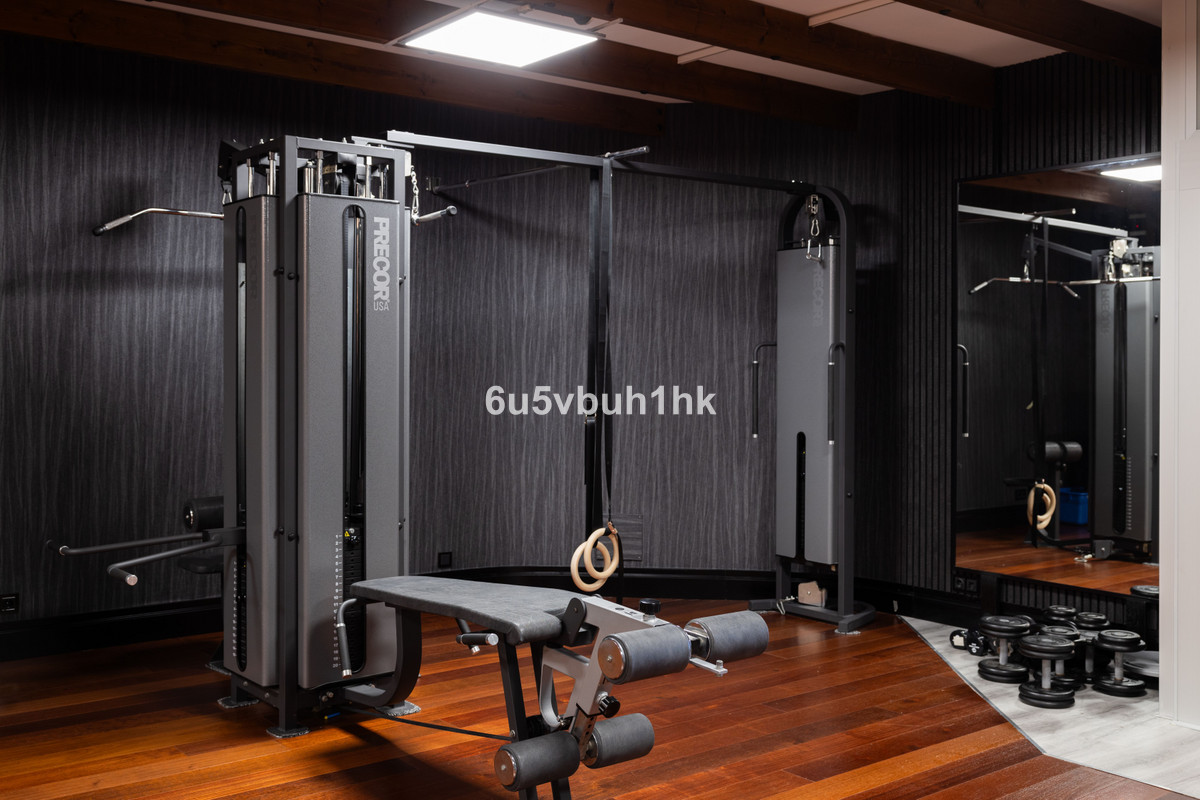 The ground floor includes four additional bedrooms, each with direct access to the landscaped garden and the inviting, heated pool. Adjacent to the pool, a Finnish sauna provides a perfect spot for relaxation. This floor also includes a massive gym with its large mural depicting Lake Inari in Lapland, and a large garage for convenience.