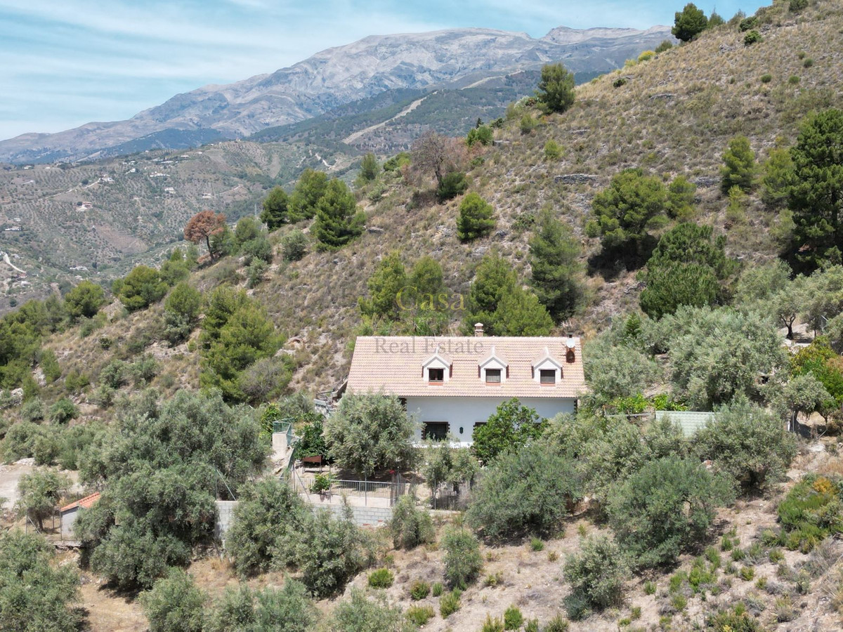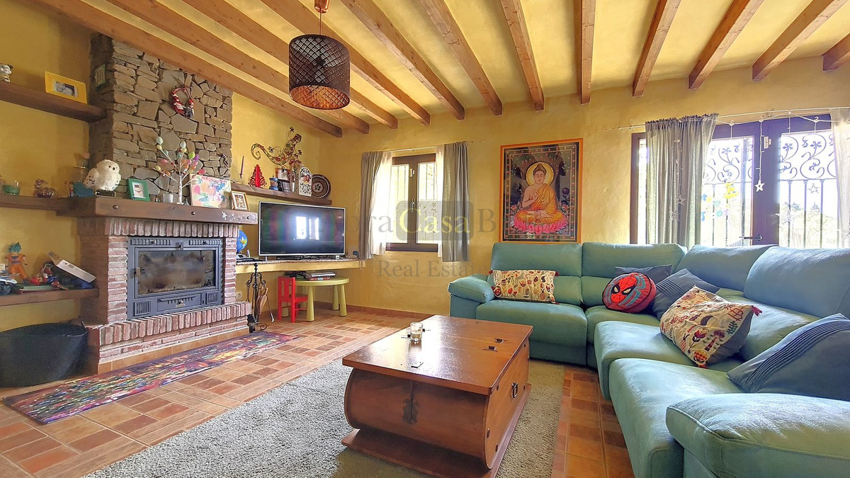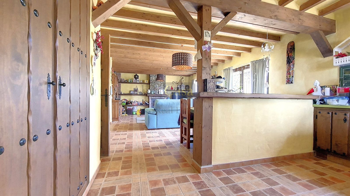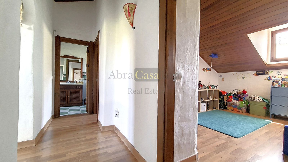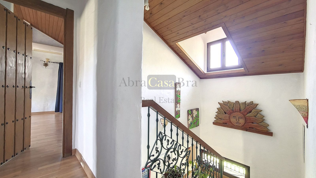 Når man træder ind, bemærker man straks den varme og landlige atmosfære. De typiske andalusiske trædøre er specialfremstillet efter mål. Det stilfulde klinkegulv er af meget god kvalitet, og de smukke træbjælkelofter fuldender det hele. I stueetagen er der et badeværelse med bruser og toilet. Ved siden af er der et stort opbevaringsrum til bl.a. vaskemaskinen. Længere nede, for enden af gangen, er der et rummeligt soveværelse, der i øjeblikket bruges som legeværelse for børnene. Til højre for hallen kommer man ind i stue/spisestuen med åbent køkken, som er fuldt udstyret. Der er en stor pejs i dette rum. Fra glasdørene i midten af rummet er der udsigt til terrassen på siden af huset.
