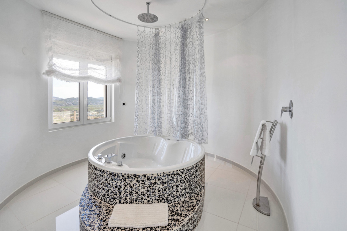 The living area ioffers sevral seating areas such as a television corner, a chill out spot and a marvelous seating area boasting panoramic sea views. From the living is direct access to the main terrace with a private swimming pool and an exterior shower and toilet.