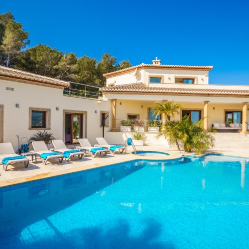 Modern and spacious villa of 795 m2 sitting on a plot of 1760 m2, with spectacular sea and mountain views, located in the popular area of La Corona, overlooking the Port of Jávea. Boasting 2 swimming pools, heated indoor and outdoor swimming pool, a fully equipped cinema, bar/games room, a yoga/stretch area, two saunas and a jacuzzi overlooking the Mediterranean sea.