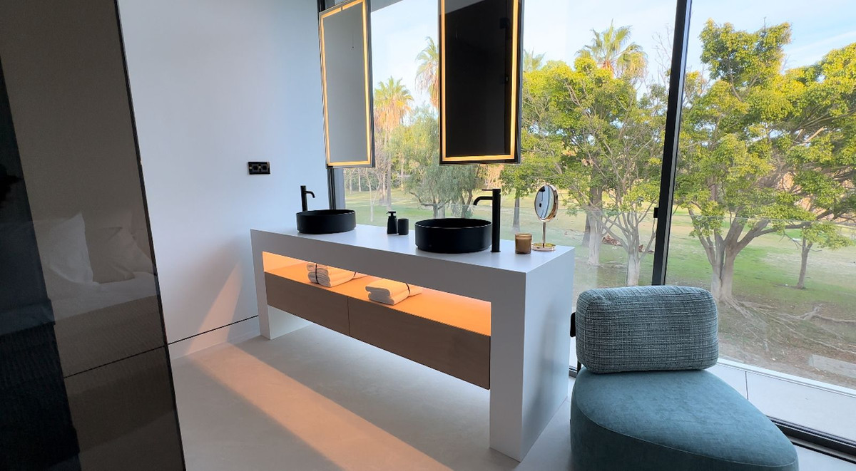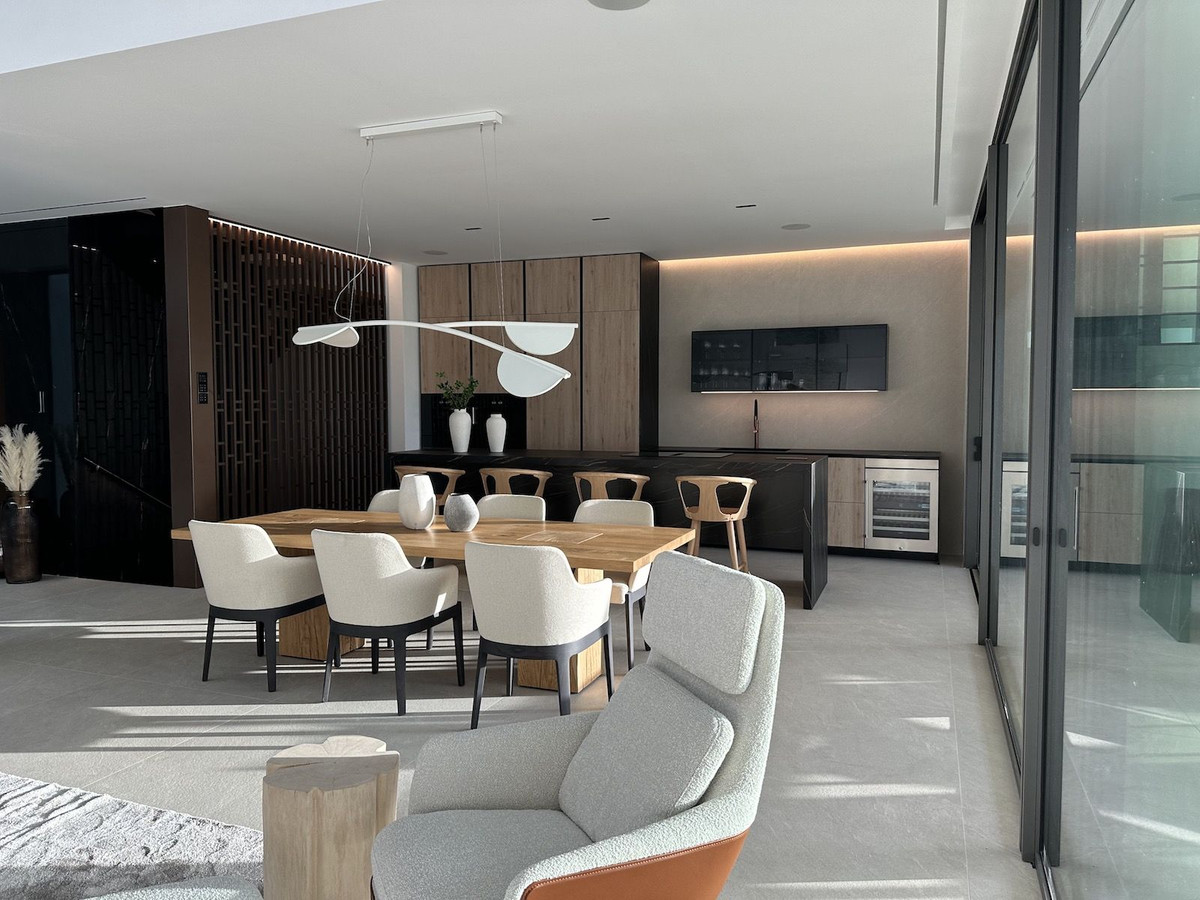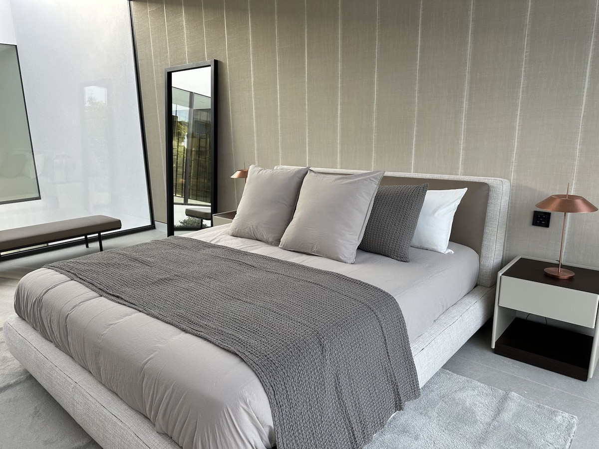 The villa has been built in four levels, including a basement that can be customized and a rooftop terrace with a small heated pool. Designed with an open layout to maximize space and natural light, it includes a private lift to access all levels. On the first level, you find the master bedroom suite with a designer walk-in wardrobe, a terrace, and