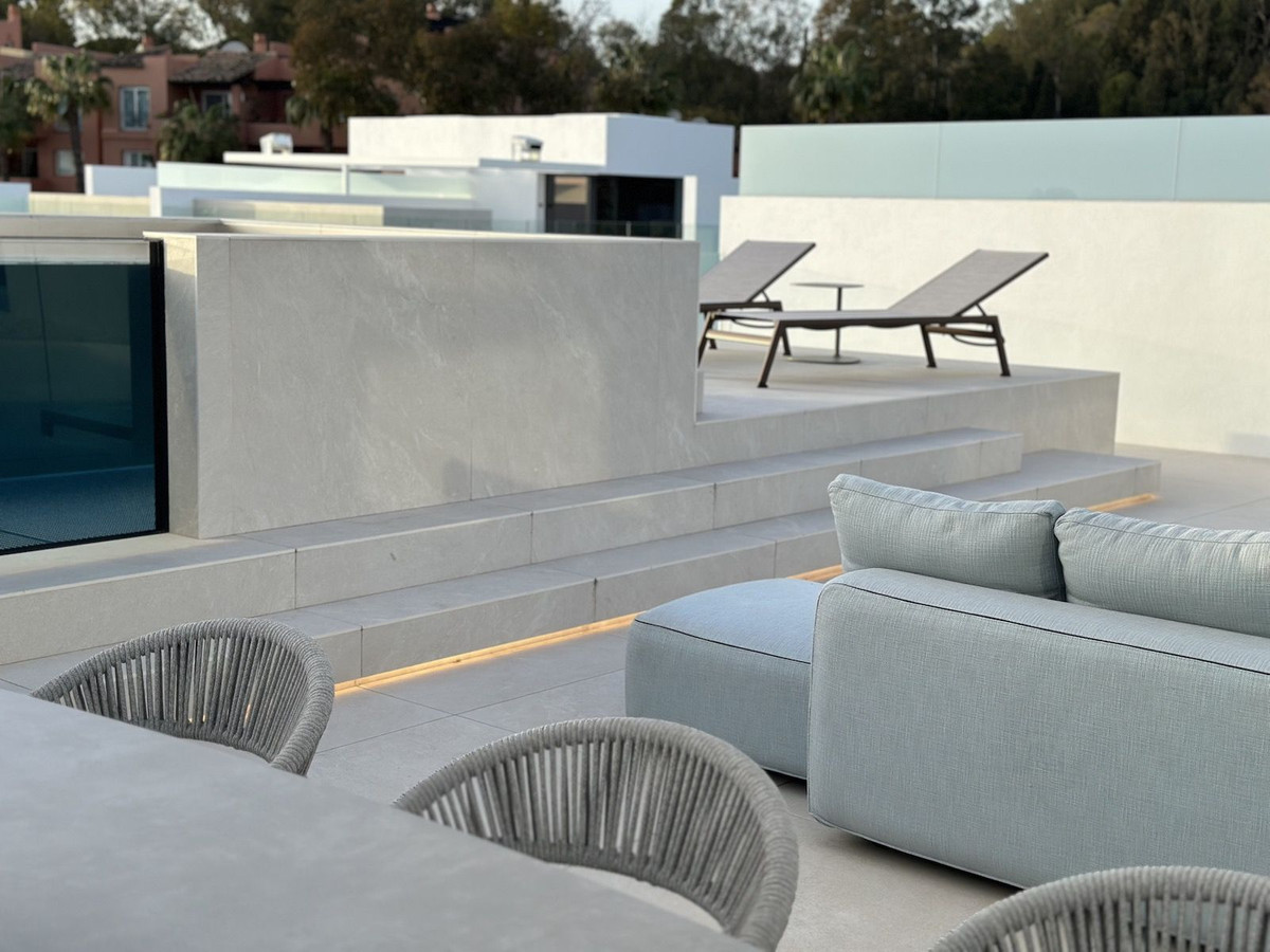 Brand new modern villa located in the prestigious area of Marbella's Golden Mile, close to the beach and within a secure community. This home is all about comfort and convenience, featuring modern architecture and private amenities.