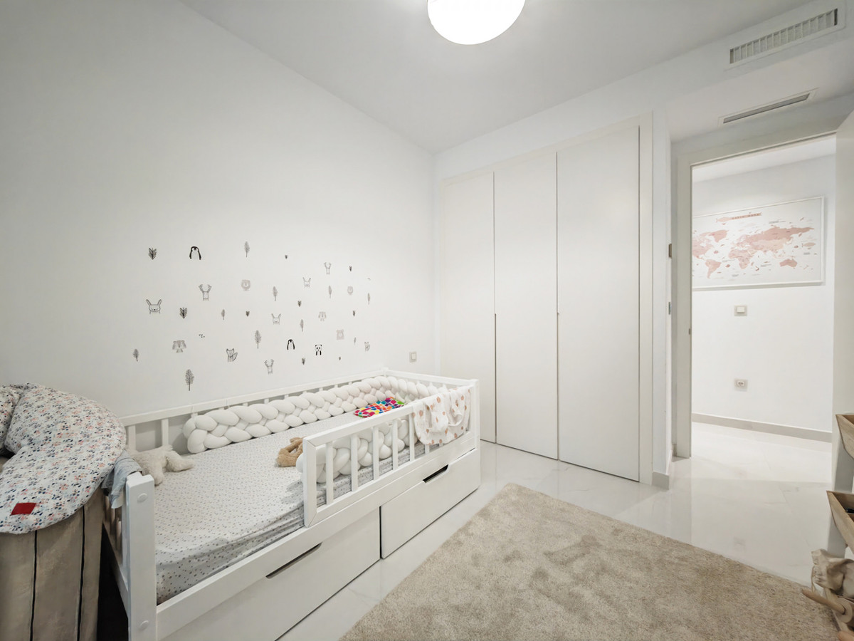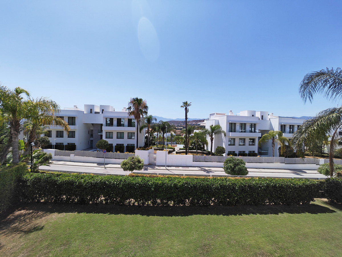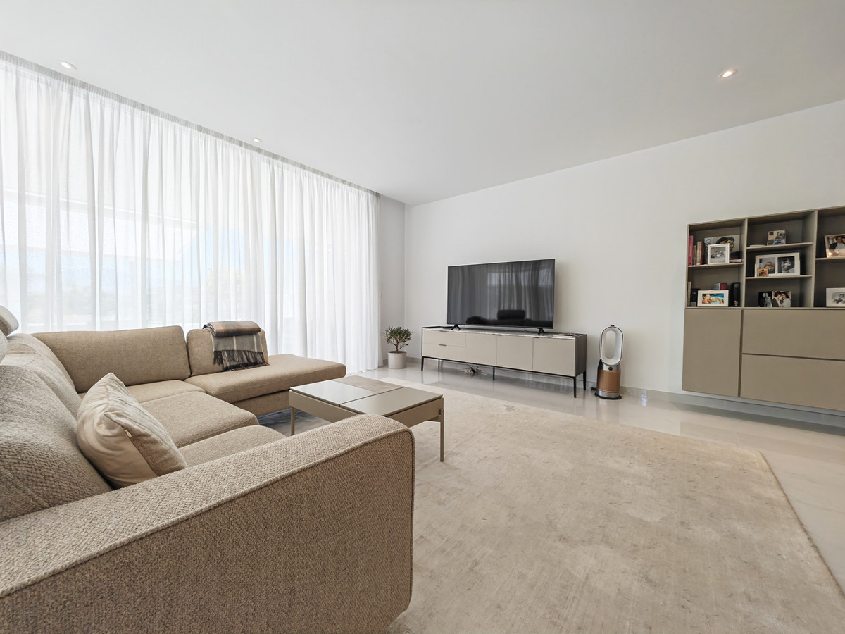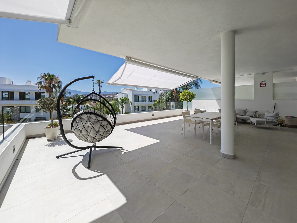Apartment for sale in Nueva Atalaya, Estepona with 3 bedrooms, 2 bathrooms, 1 on suite bathroom and with orientation west, with communal swimming pool, private garage (2 parking spaces) and communal garden. Regarding property dimensions, it has 122 m² built, 115 m² interior and 78 m² terrace. Has the following facilities front line golf, mountainside, amenities near, air conditioning, central heating, fully fitted kitchen, marble floors, satellite tv, storage room, gym, alarm, security entrance, double glazing, video entrance, dining room, barbecue, security service 24h, private terrace, kitchen equipped, living room, country view, mountain view, golf view, heated pool, automatic irrigation system, security shutters, internet - wi-fi, covered terrace, 24h service, electric blinds, fitted wardrobes, gated community, lift, garden view, panoramic view, doorman, close to children playground, close to sea / beach, close to golf, uncovered terrace, glass doors, balcony, excellent condition, urban view, ceiling cooling system, ceiling heating system, close to shops, close to town, close to port, close to schools, surveillance cameras, inside golf resort and pets allowed.
