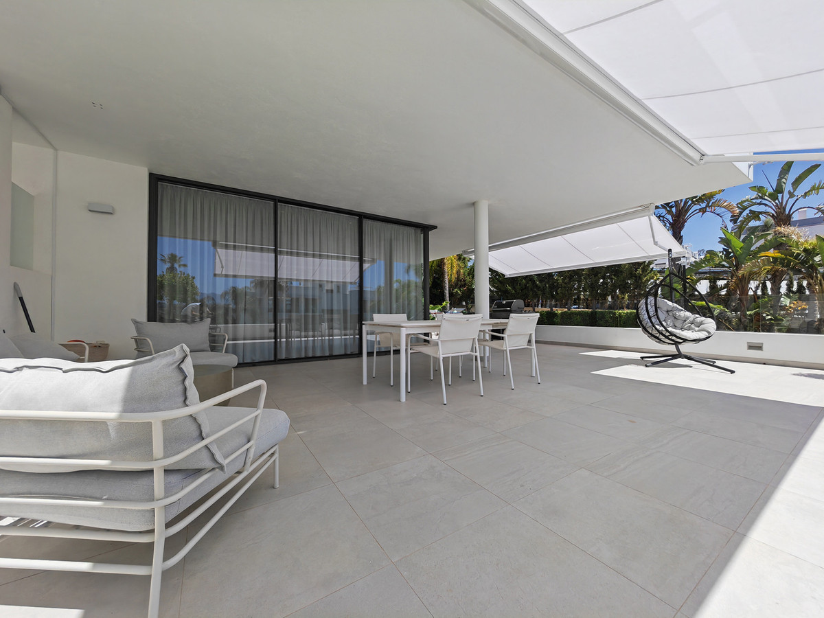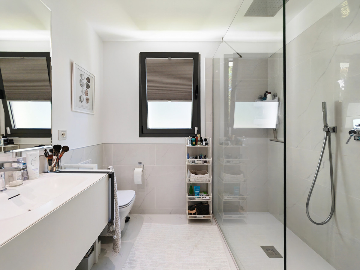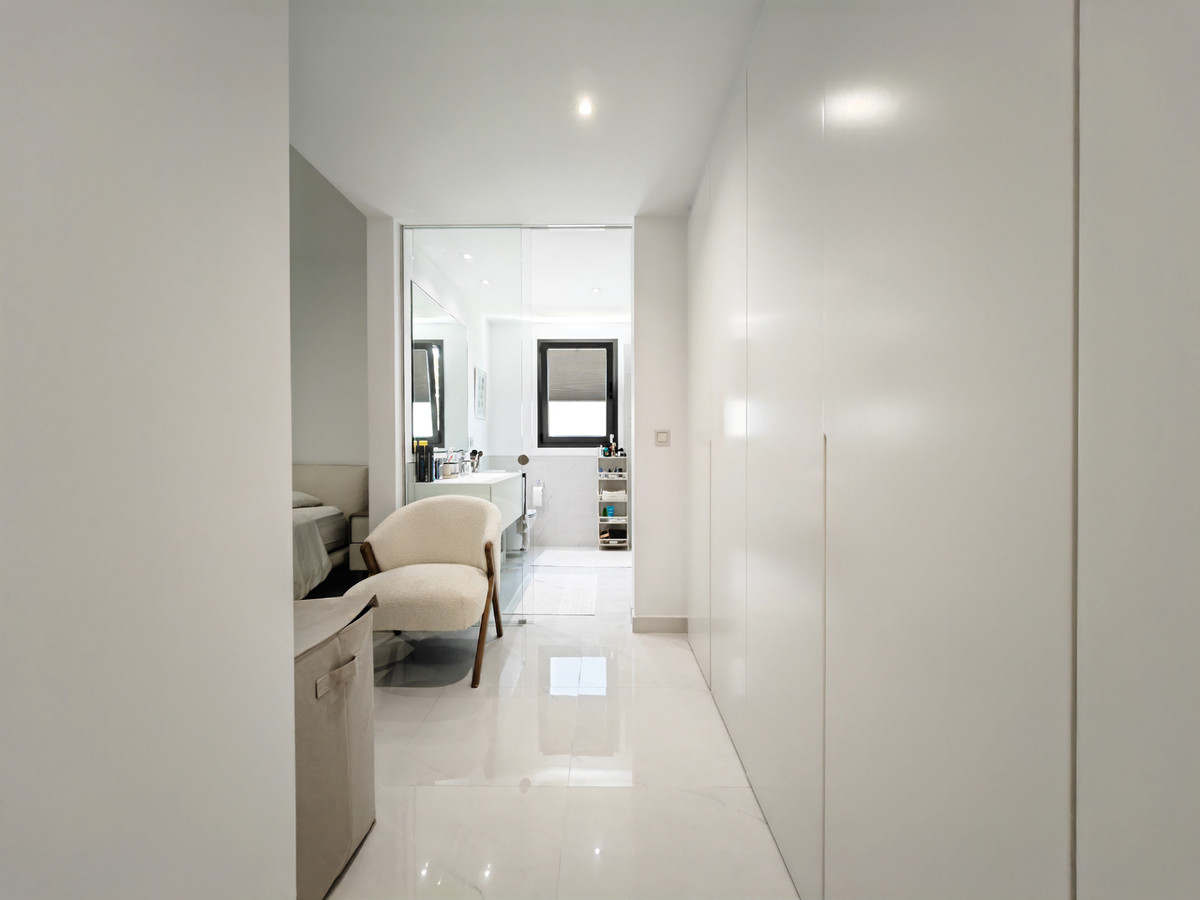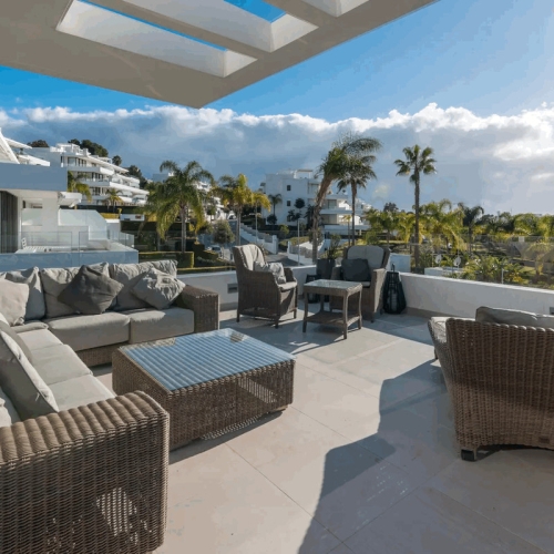 Apartment for sale in Nueva Atalaya, Estepona with 3 bedrooms, 2 bathrooms, 1 on suite bathroom and with orientation west, with communal swimming pool, private garage (2 parking spaces) and communal garden. Regarding property dimensions, it has 122 m² built, 115 m² interior and 78 m² terrace. Has the following facilities front line golf, mountainside, amenities near, air conditioning, central heating, fully fitted kitchen, marble floors, satellite tv, storage room, gym, alarm, security entrance, double glazing, video entrance, dining room, barbecue, security service 24h, private terrace, kitchen equipped, living room, country view, mountain view, golf view, heated pool, automatic irrigation system, security shutters, internet - wi-fi, covered terrace, 24h service, electric blinds, fitted wardrobes, gated community, lift, garden view, panoramic view, doorman, close to children playground, close to sea / beach, close to golf, uncovered terrace, glass doors, balcony, excellent condition, urban view, ceiling cooling system, ceiling heating system, close to shops, close to town, close to port, close to schools, surveillance cameras, inside golf resort and pets allowed.