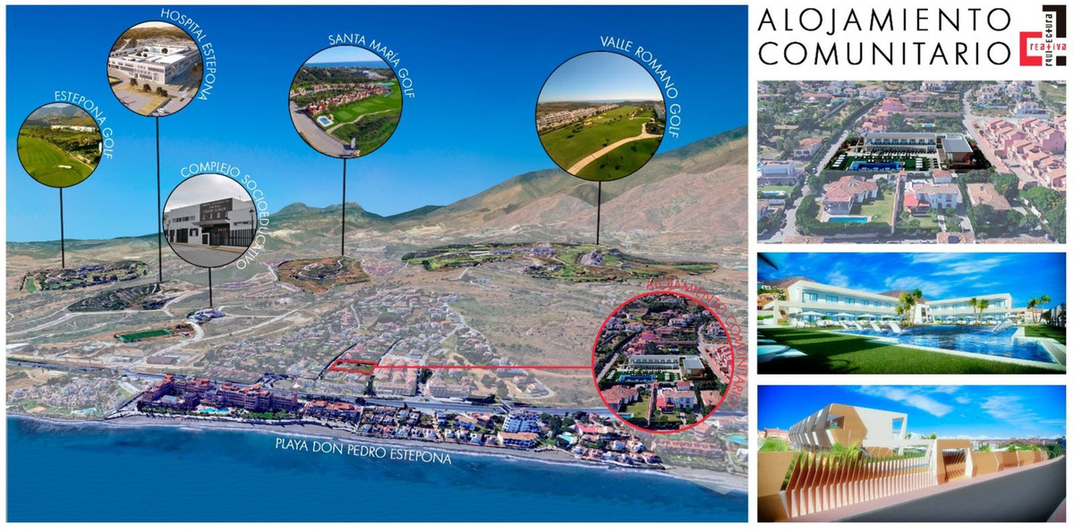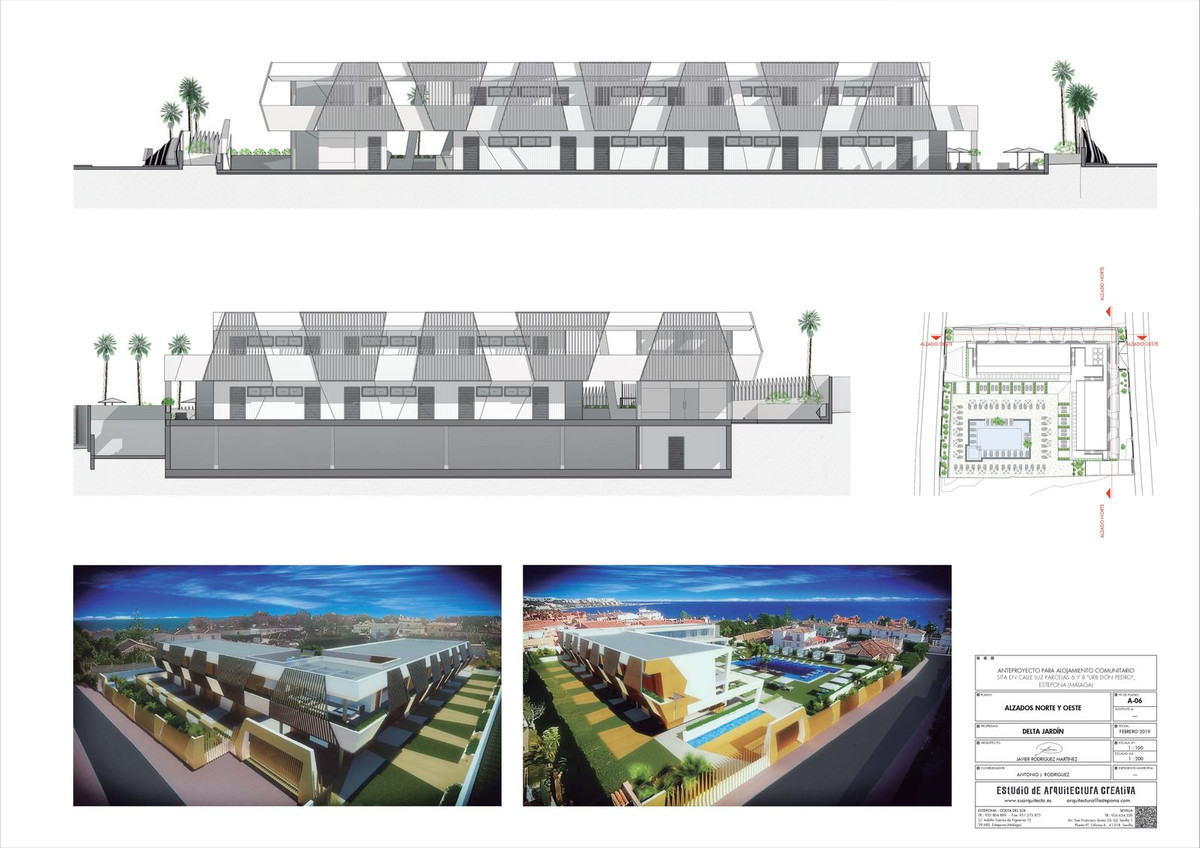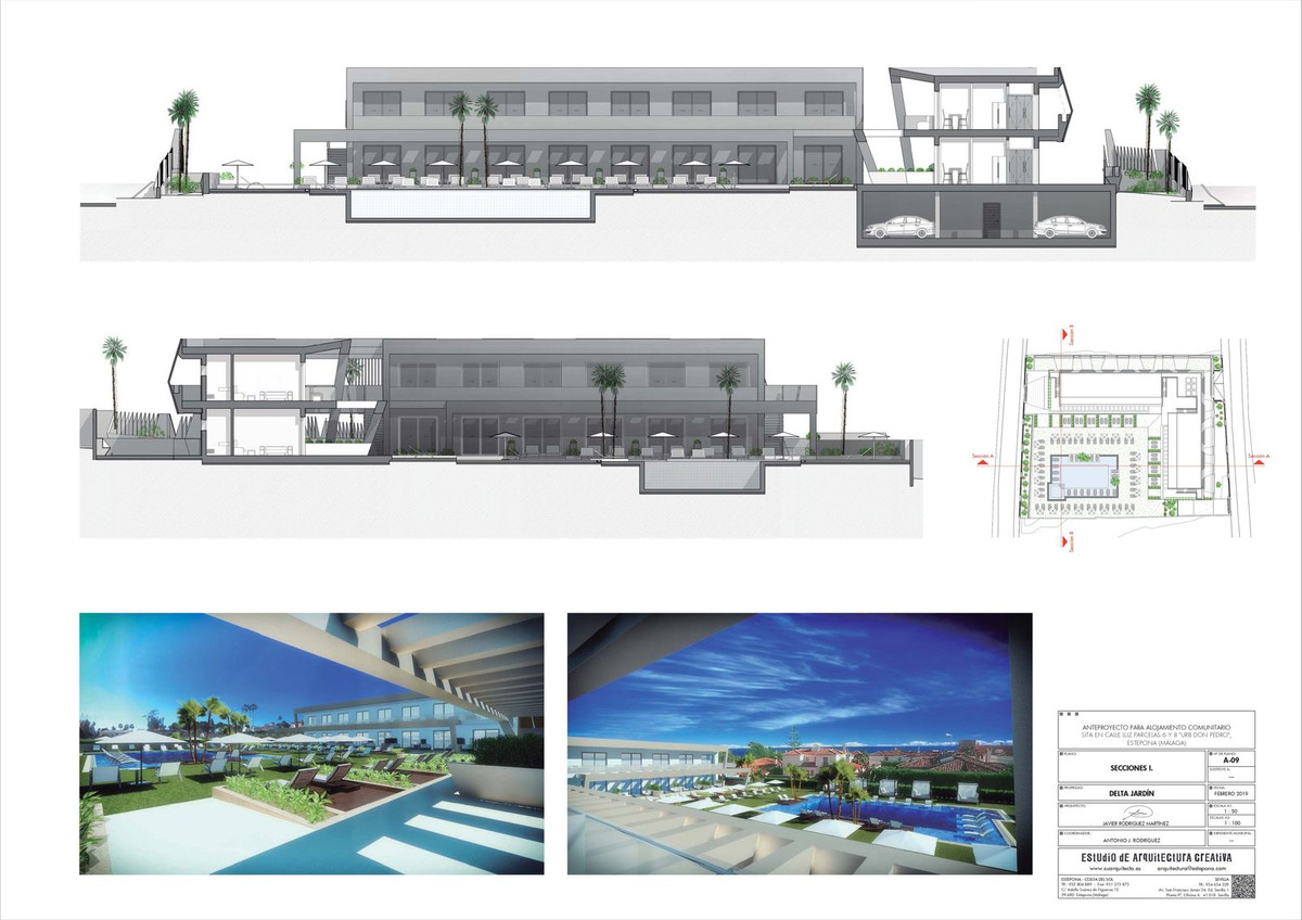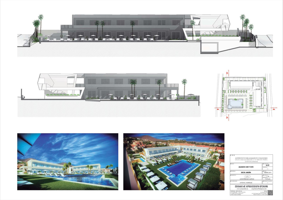 Unique project of an exclusive aparthotel in Estepona located on the plot of 3434m2. Possible to built an aparthotel of 838m2 with 2 storeys, 28 apartments, restaurant, swimming pool and underground parking.