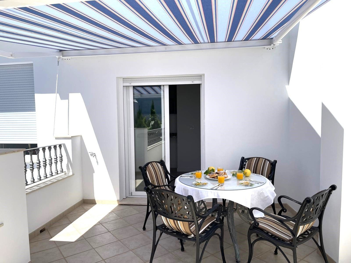 The first floor houses the second apartment, which exudes a sense of spaciousness and comfort. It boasts two double bedrooms, a stylish living room, and a well-appointed shower room. The separate kitchen, with its sleek finishes, provides ample space for culinary pursuits and leads out to a large terrace, offering a serene retreat for relaxation and outdoor gatherings.