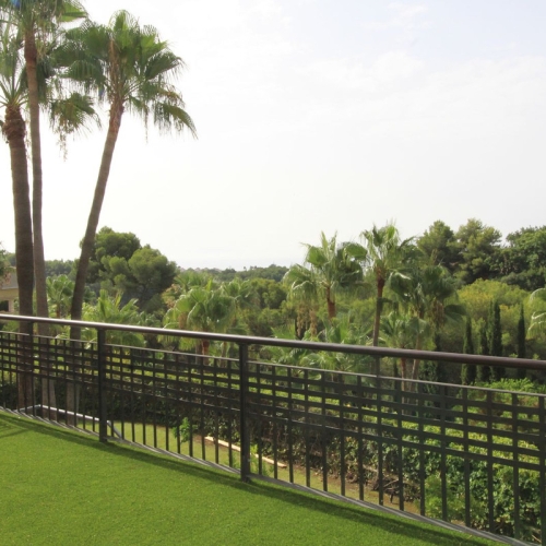 Lejligheden ligger i stueetagen og har en rummelig, delvist overdækket terrasse, der tilbyder privatliv og en fantastisk panoramaudsigt over de frodige haver med palmer og Middelhavet i det fjerne. Indenfor finder du en indbydende entré, et moderne køkken med Siemens-apparater, et hyggeligt morgenmadshjørne og en separat terrasse. Det store soveværelse har direkte adgang til hovedterrassen og har et luksuriøst en-suite badeværelse. Gæsteværelset har også et en-suite badeværelse og adgang til terrassen. Stuen med pejs åbner ud mod hovedterrassen, der er ideel til spisning, afslapning og solbadning. Yderligere faciliteter omfatter marmorgulve, fuld aircondition, videotelefon, alarmsystem og elektriske skodder. Ejendommen tilbyder også nem adgang til en underjordisk garage med rigelig parkering og et rummeligt opbevaringsrum.