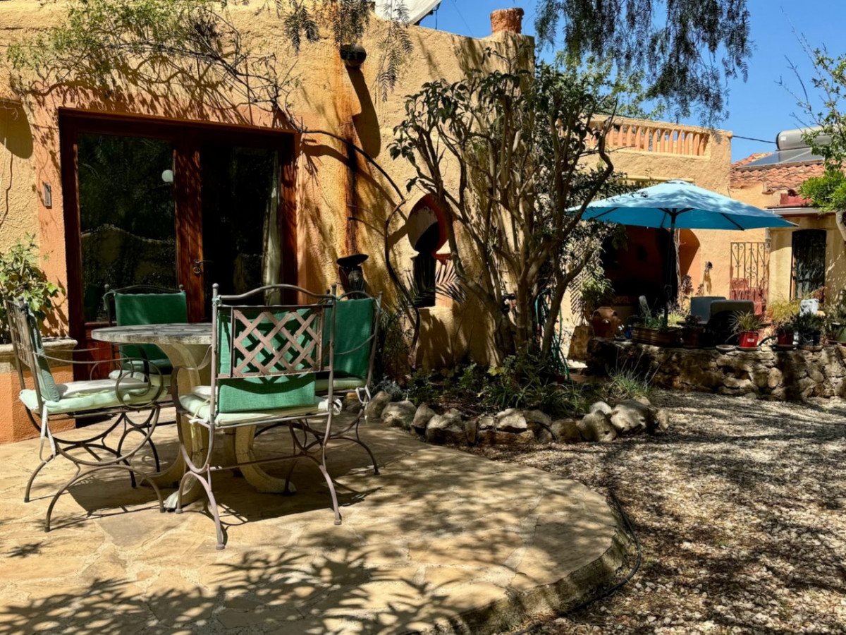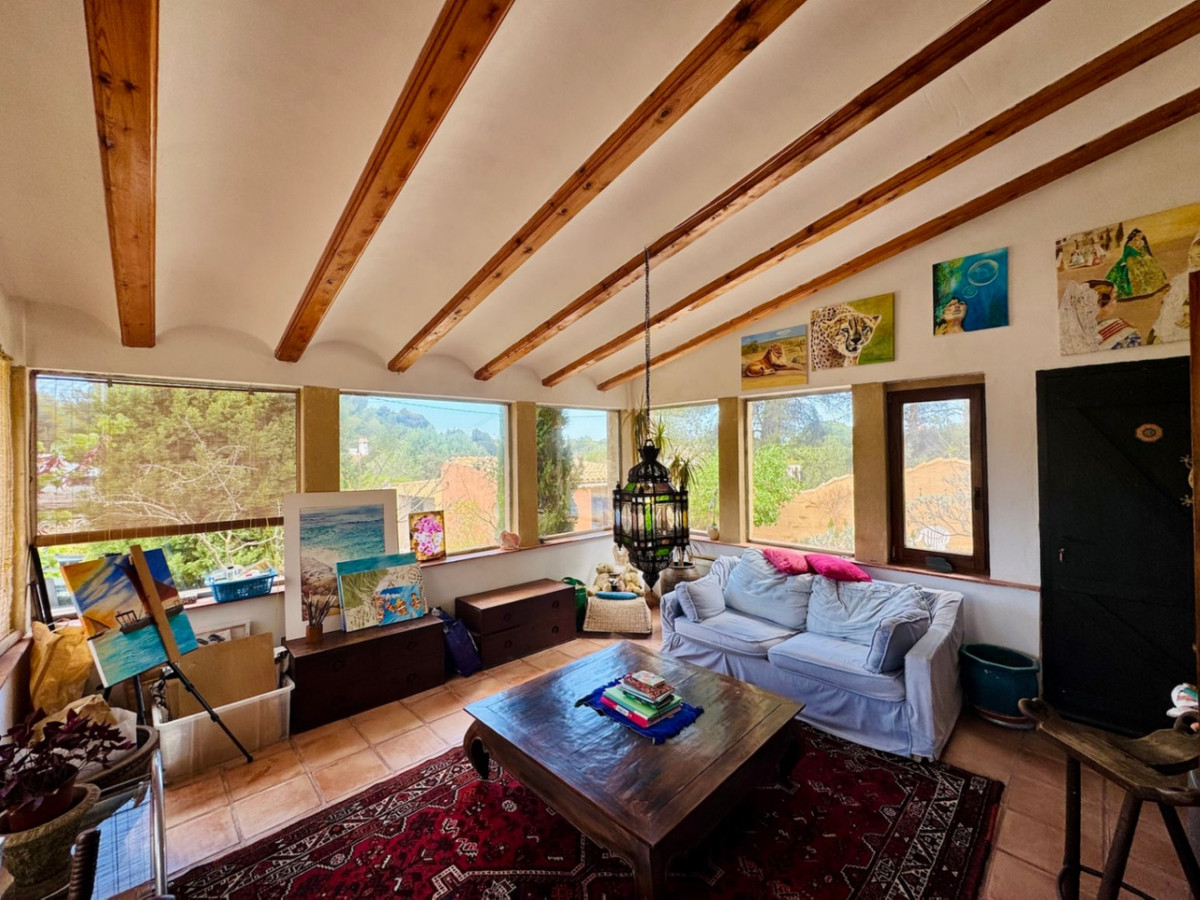 Opening the front door of the main house, you walk into the artist's room with fantastic views of Montgo. Adjacent is an open living area with study corner, Arabic details and a fireplace cassette. A unique open kitchen with laundry room leads to a seperate dining room with access to the beautiful garden. There are 2 double bedrooms with dressing room and 1 family bathroom with shower in the main house.