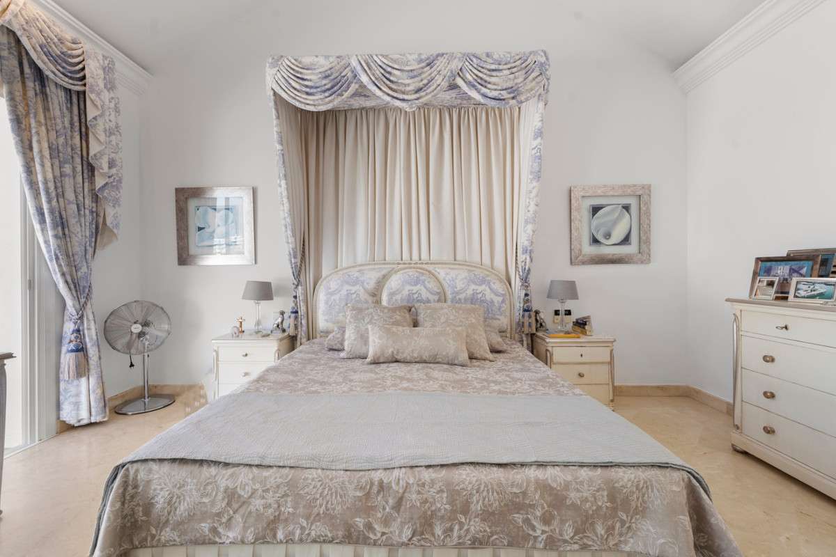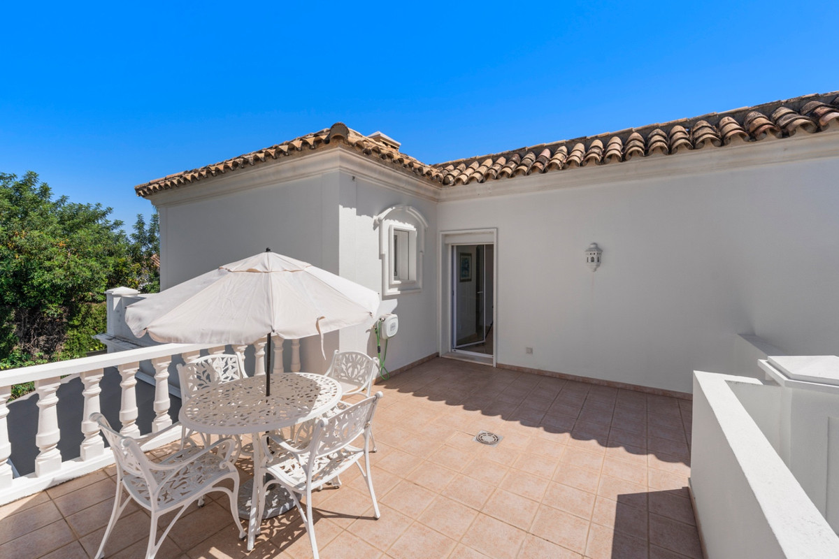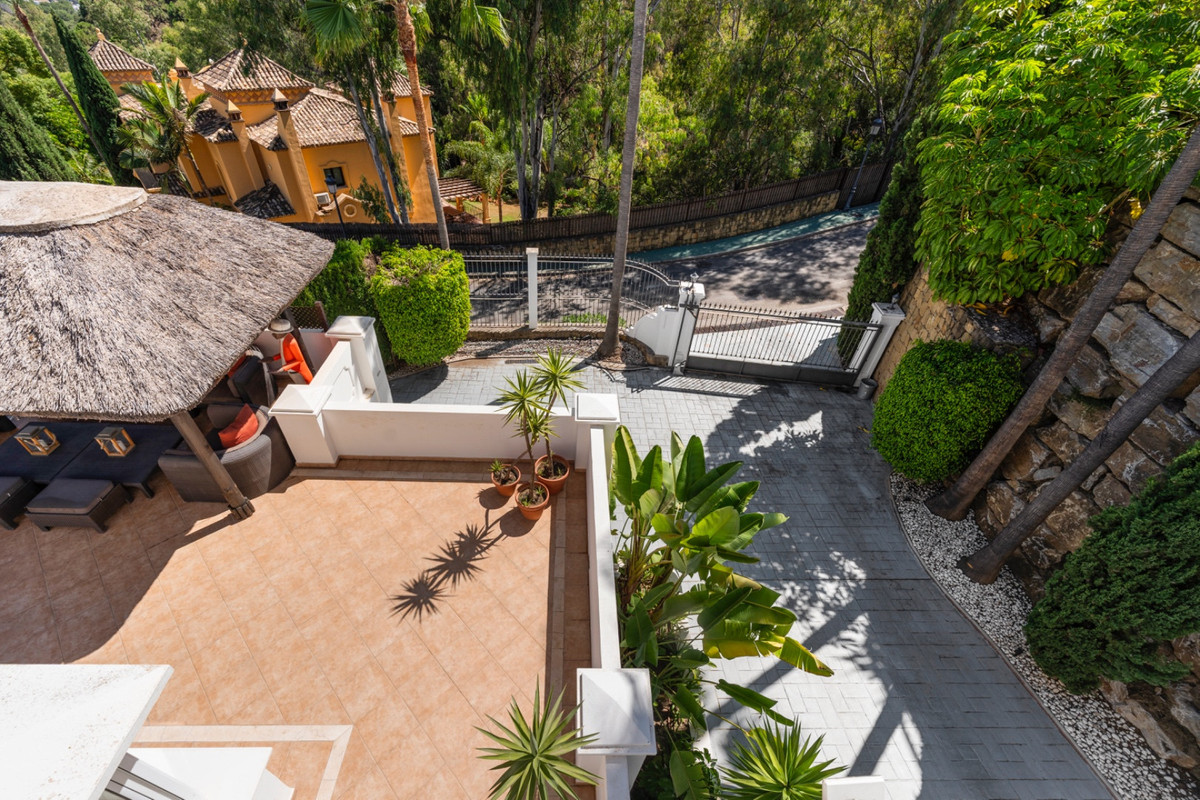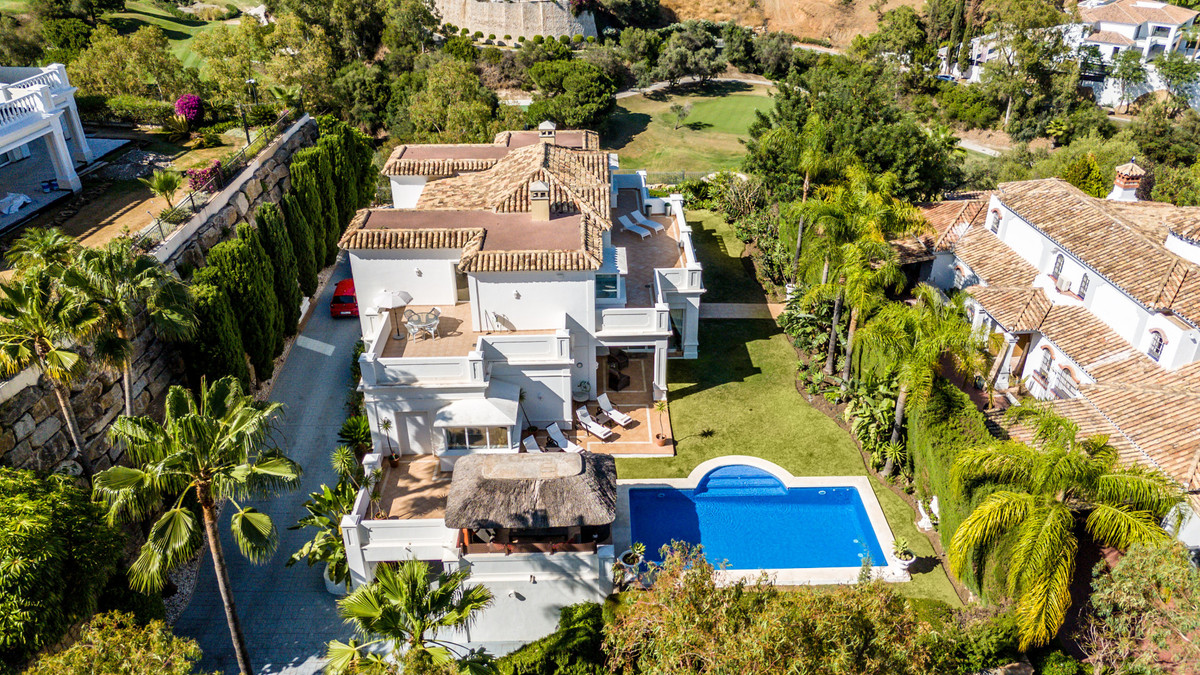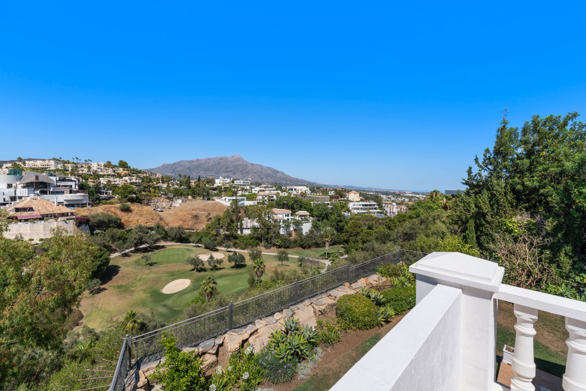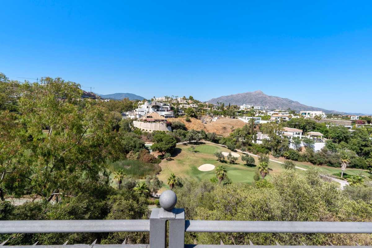Villa Alto sits proudly within one of the coast's most exclusive gated communities, surrounded by a world-class golf course and protected by 24-hour security. This elegant five-bedroom villa combines privacy, space, and style across three levels, offering panoramic views of La Concha mountain and the lush golf valley.