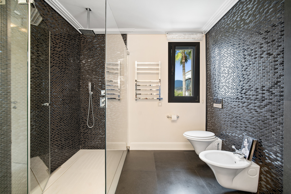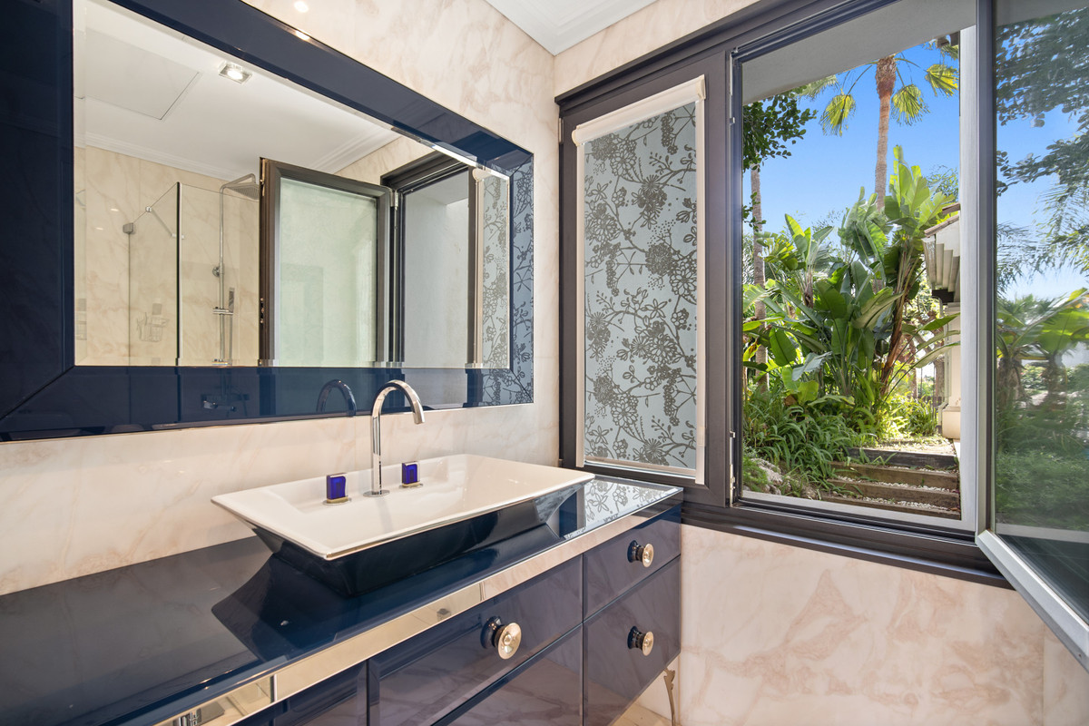 Dejlig seks-værelses, sydvendt luksus villa i Lomas de Magna Marbella, en af de mest prestigefyldte komplekser på Marbella's Golden Mile. Villaen er beliggende i et gated samfund, der tilbyder 24-timers sikkerhed service, to store fælles pools og frodige tropiske haver af utrolig skønhed. Det er bekvemt placeret tæt på alle faciliteter, herunder supermarkeder, butikker, restauranter, skoler og golfbaner, og er kun en fem minutters kørsel fra havet.