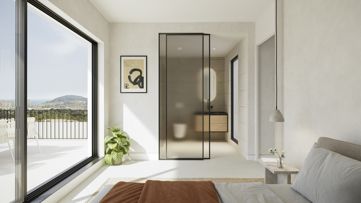 Når du går op til anden etage, finder du to soveværelser med eget bad og en generøs terrasse med panoramaudsigt over Benidorm, havet og bjergene.